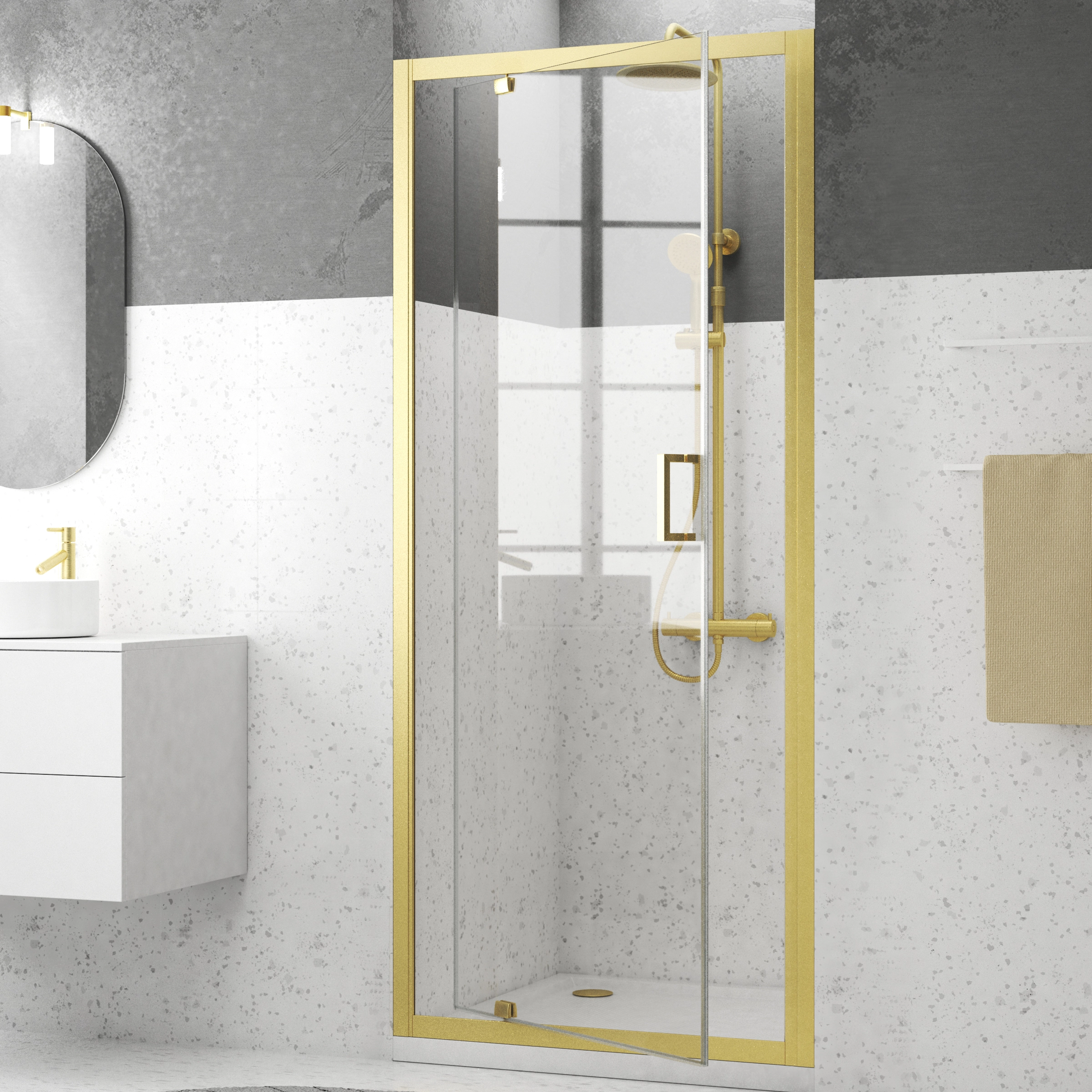 Porte de douche Pivotante 90x200cm – Profilés Or Doré Brossé – Verre Trempé 6mm – GOLDY CRUSH