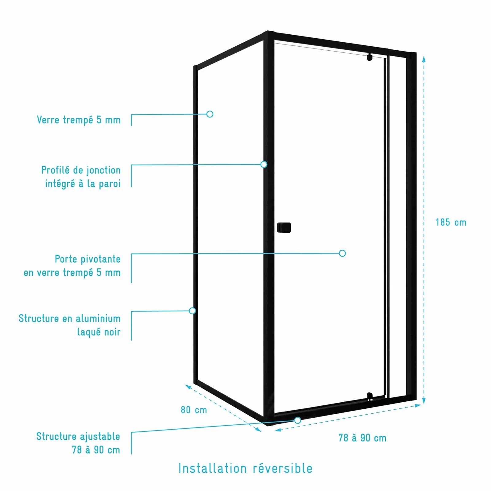 Porte de Douche Pivotante Extensible 78/90x185cm et Retour Fixe 80cm – Noir – BLACK SLIDE