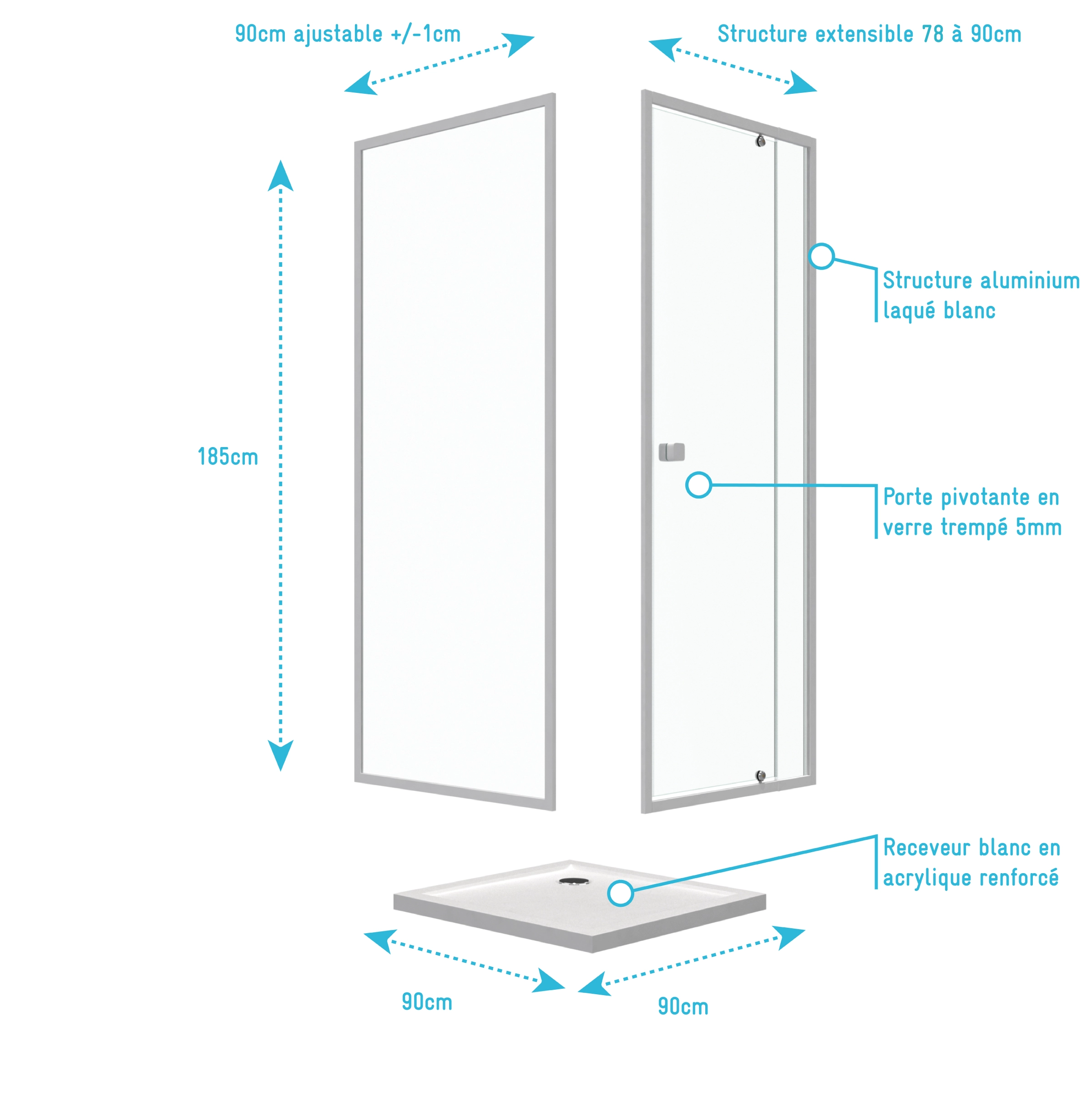 Porte de douche pivotante extensible 78 à 90cm + paroi de retour 90 + receveur 90×90 – WHITY PIVOT