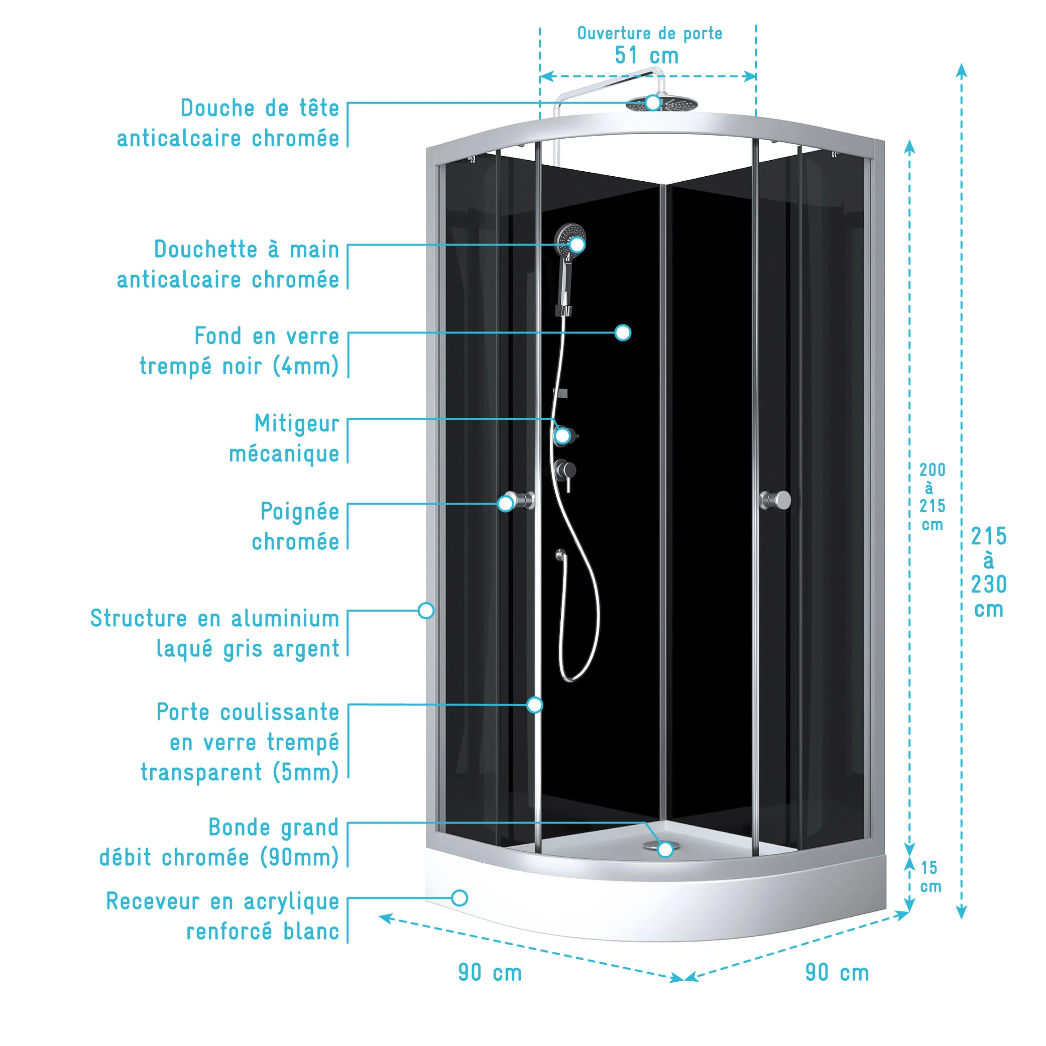 Cabine de douche 85x85x225cm 1/4 de cercle - ZEENY