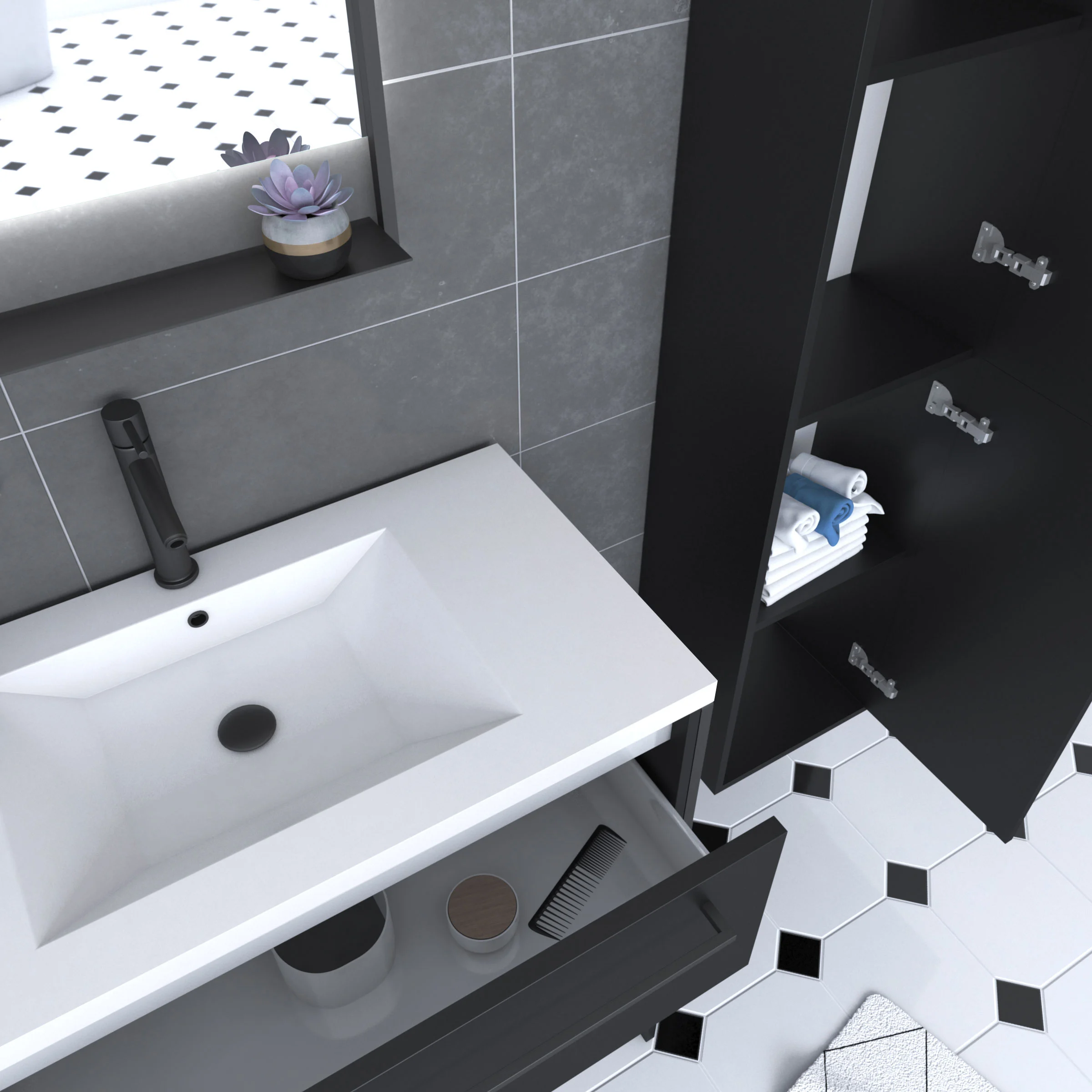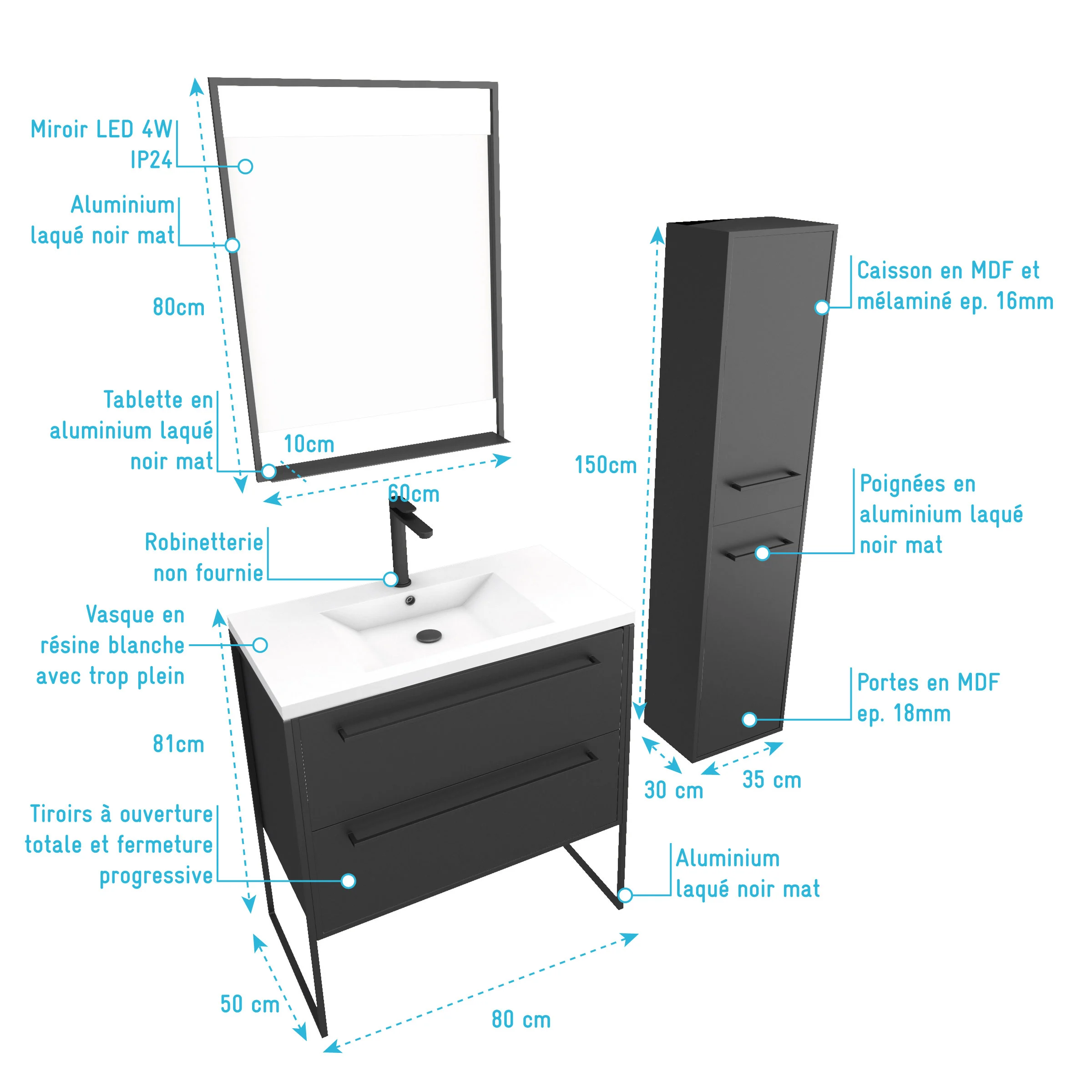 Meuble Salle de Bains 80 cm, Vasque Blanche, Miroir Led et Colonne – Noir – STRUCTURA