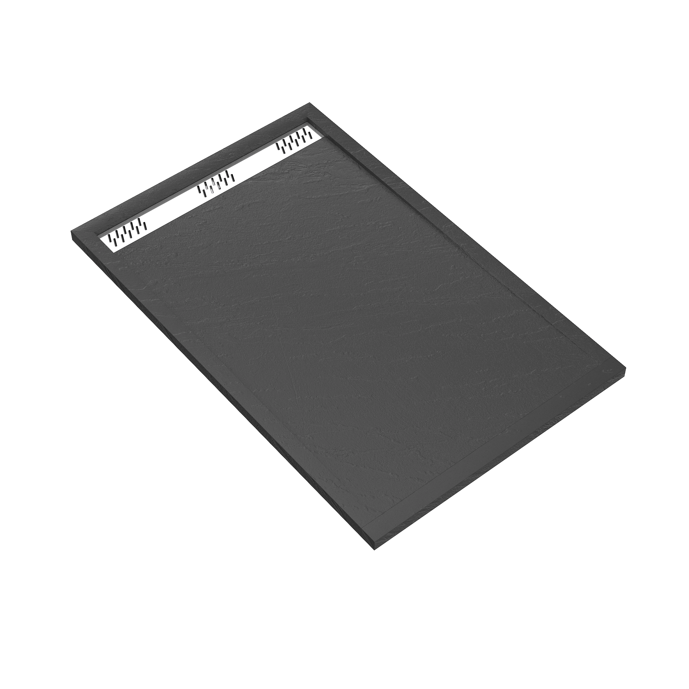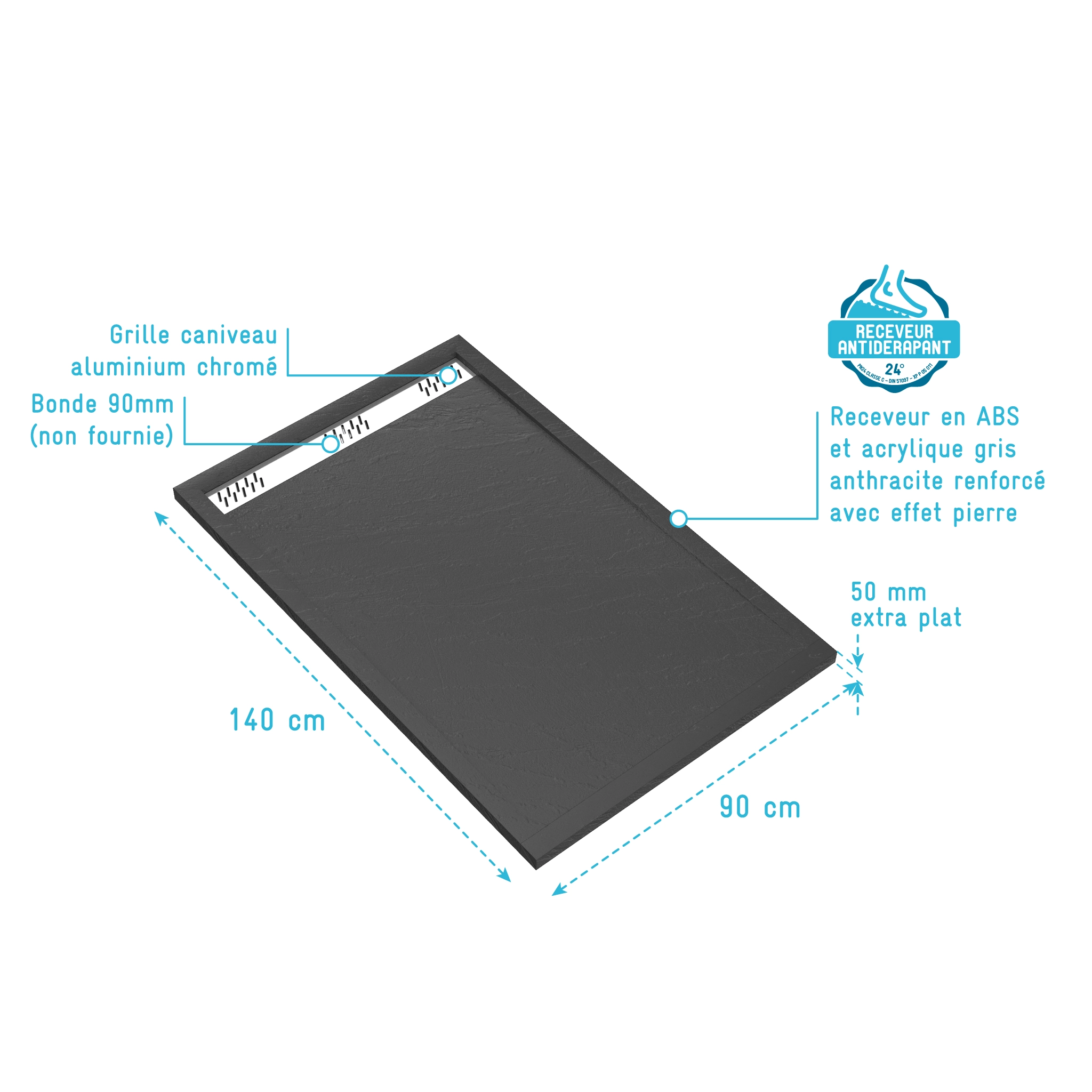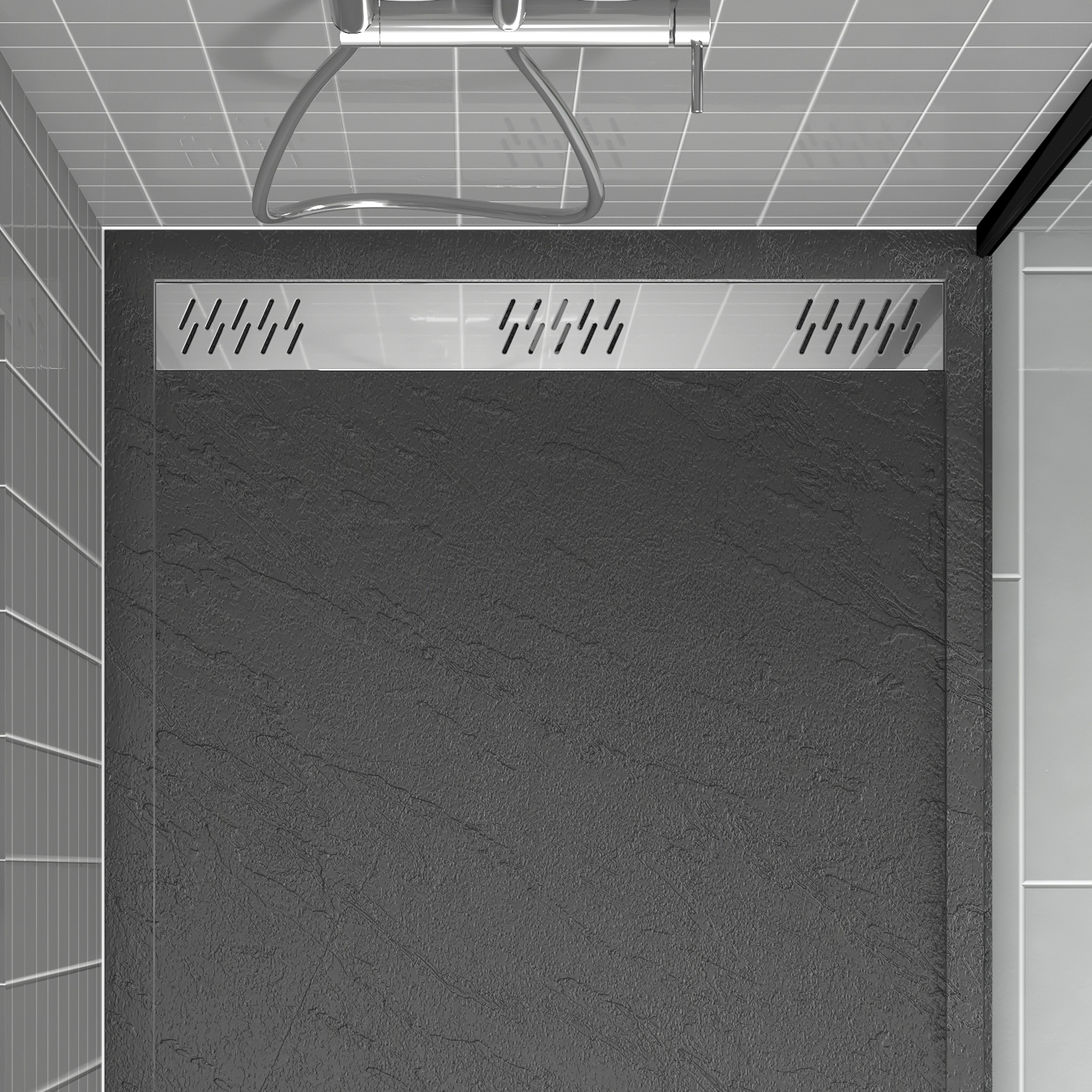 Receveur en acrylique Gris Effet Pierre 90x140x5 cm – Grille Linéaire Chrome – METEORA