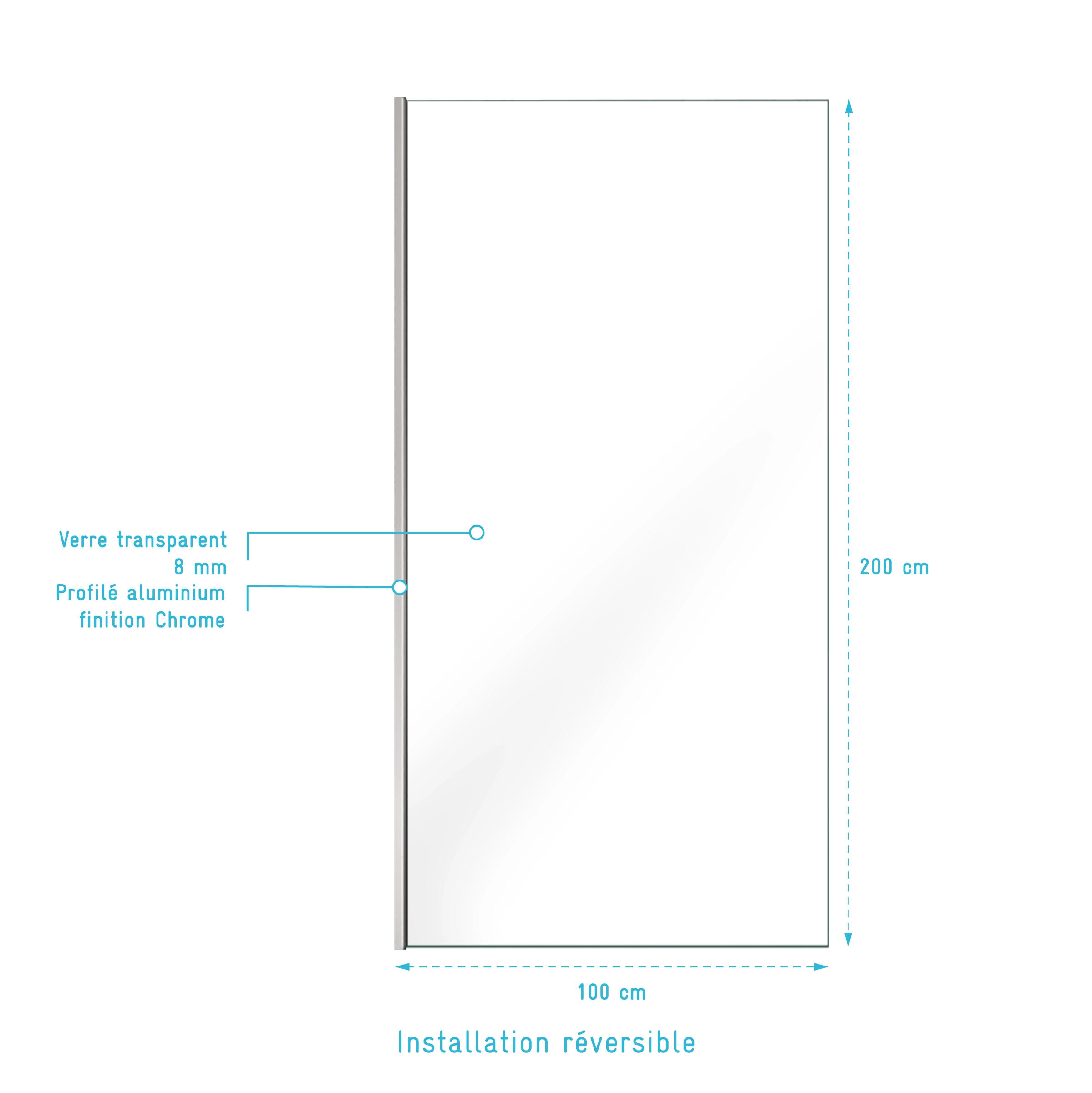 Elégante et intemporelle, la paroi de douche à l’italienne, moderne et incontournable, à l’avantage de faciliter l’accès à la douche tout en rendant votre pièce plus lumineuse et spacieuse. Le profilé en aluminium chrome ajoutera une touche de raffinement à votre salle de bains. L’installation de cette paroi est réversible.