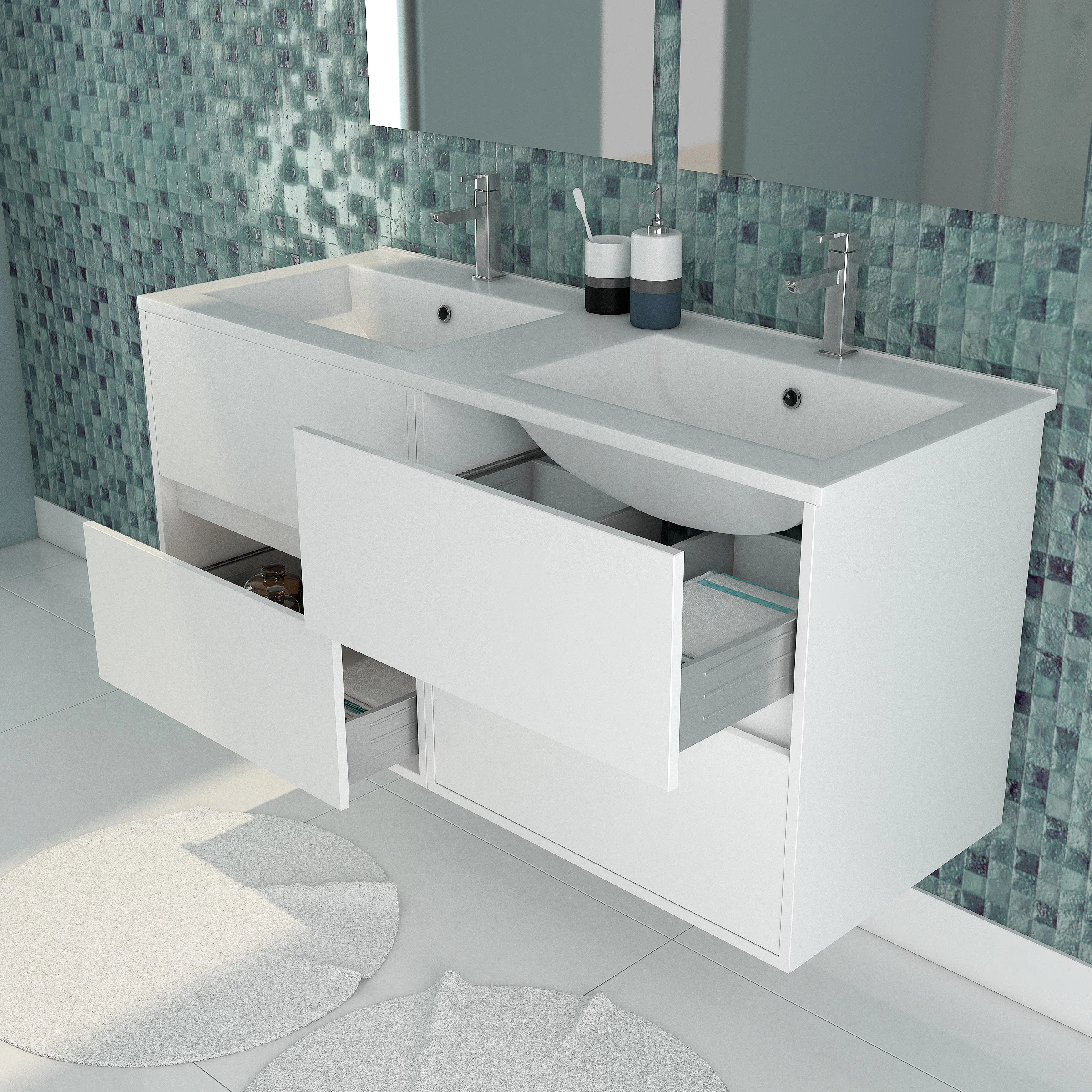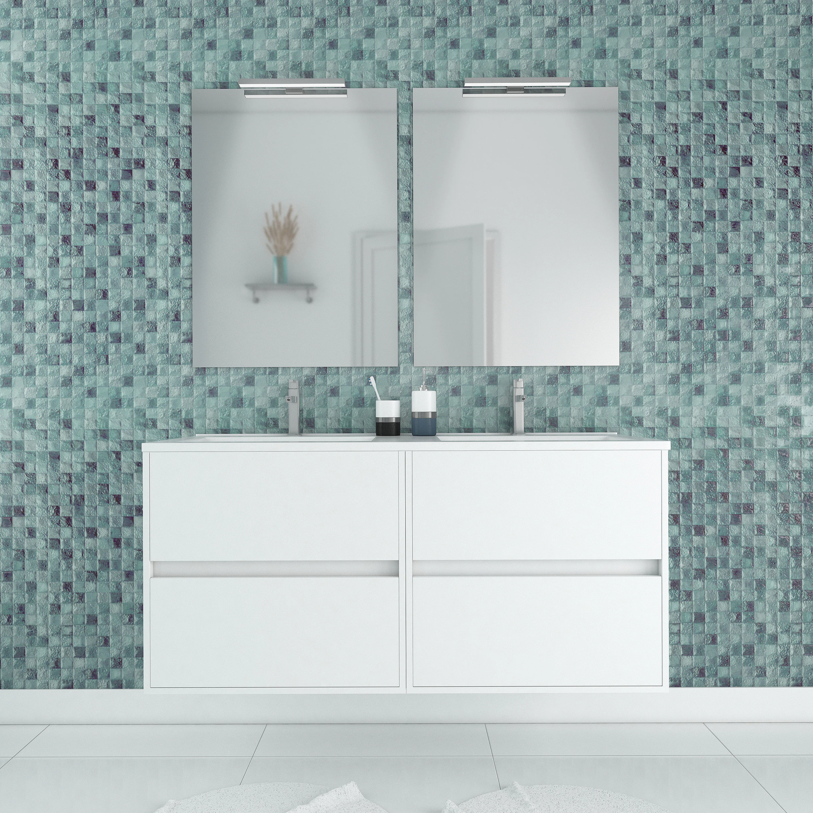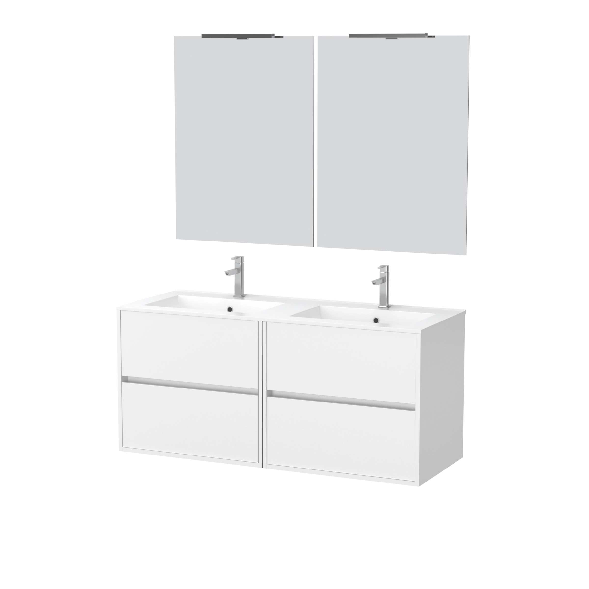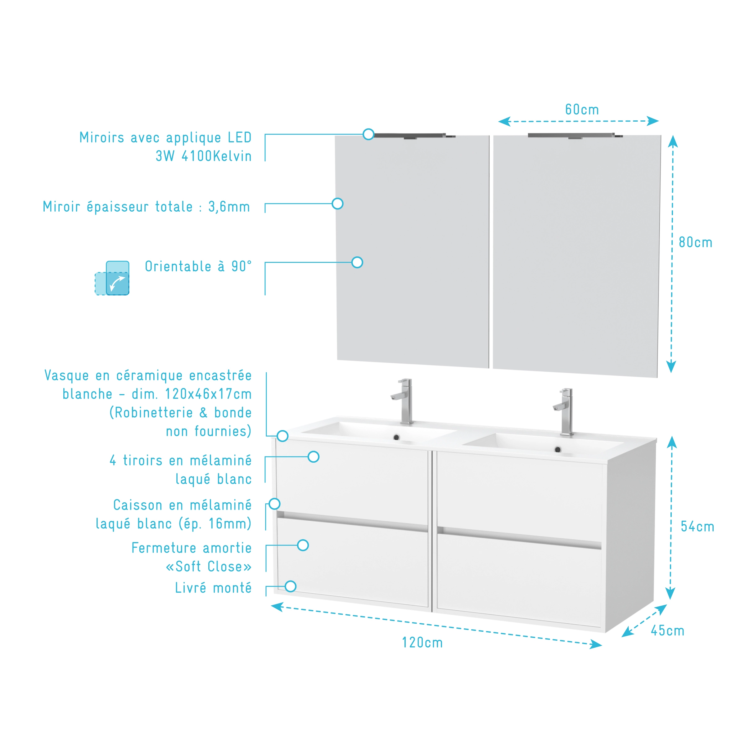 Meuble Salle de Bains 120 cm Laqué Blanc 4 Tiroirs, Vasque, Miroirs 60×80 et Réglettes Led – XENOS