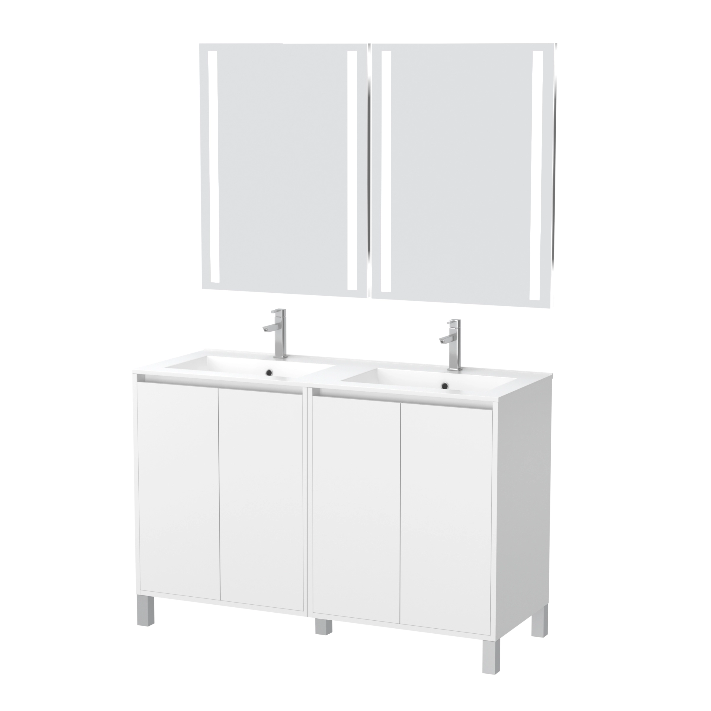 Modernisez votre salle de bain avec cet ensemble meuble équipé de 4 portes, d’une double vasque en céramique blanche et de 2 miroirs à éclairage Led.