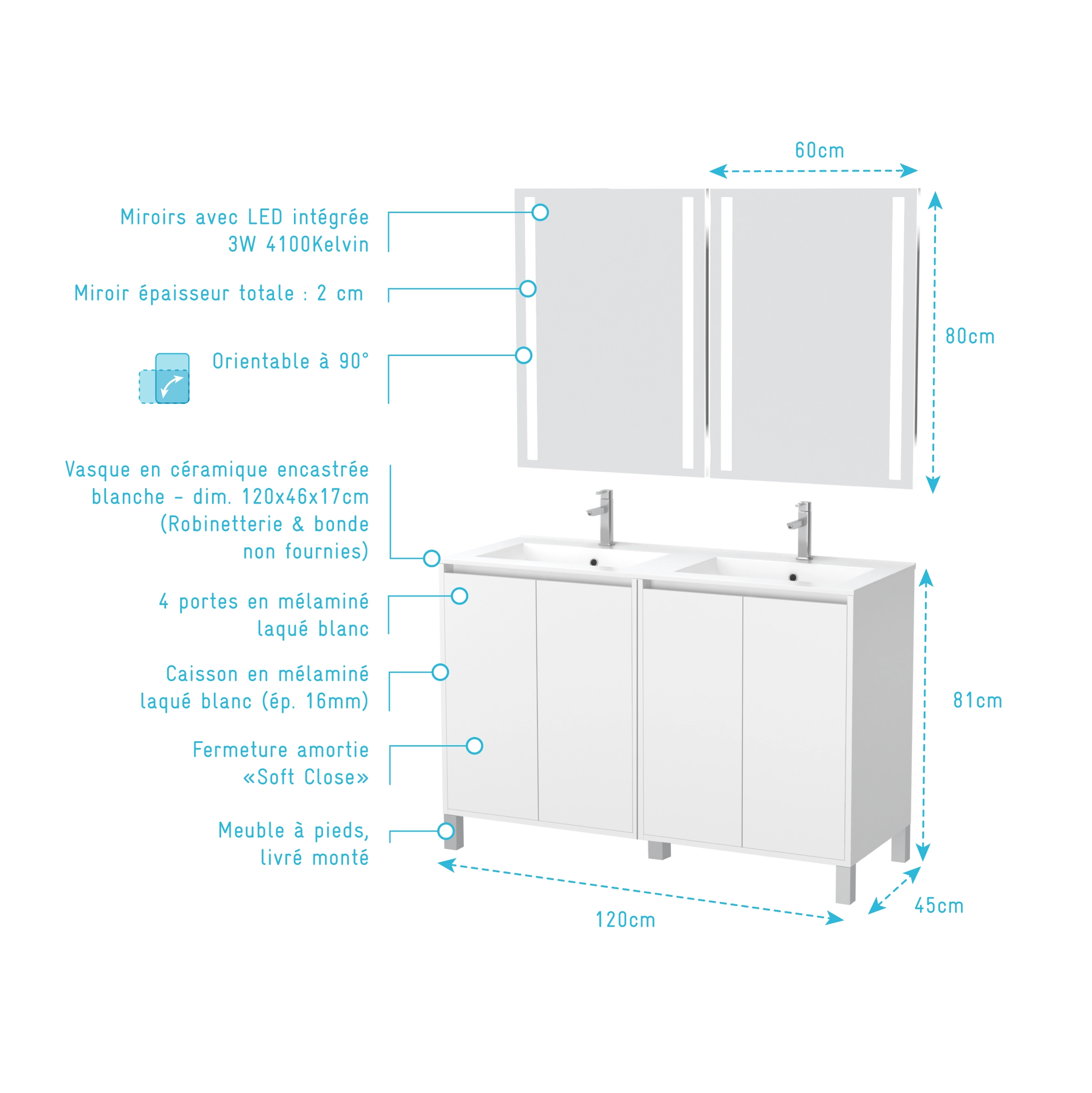 Meuble Salle de Bains 120 cm Laqué Blanc 4 Portes, Vasque, Miroirs 60×80 à Leds intégrées – XENOS
