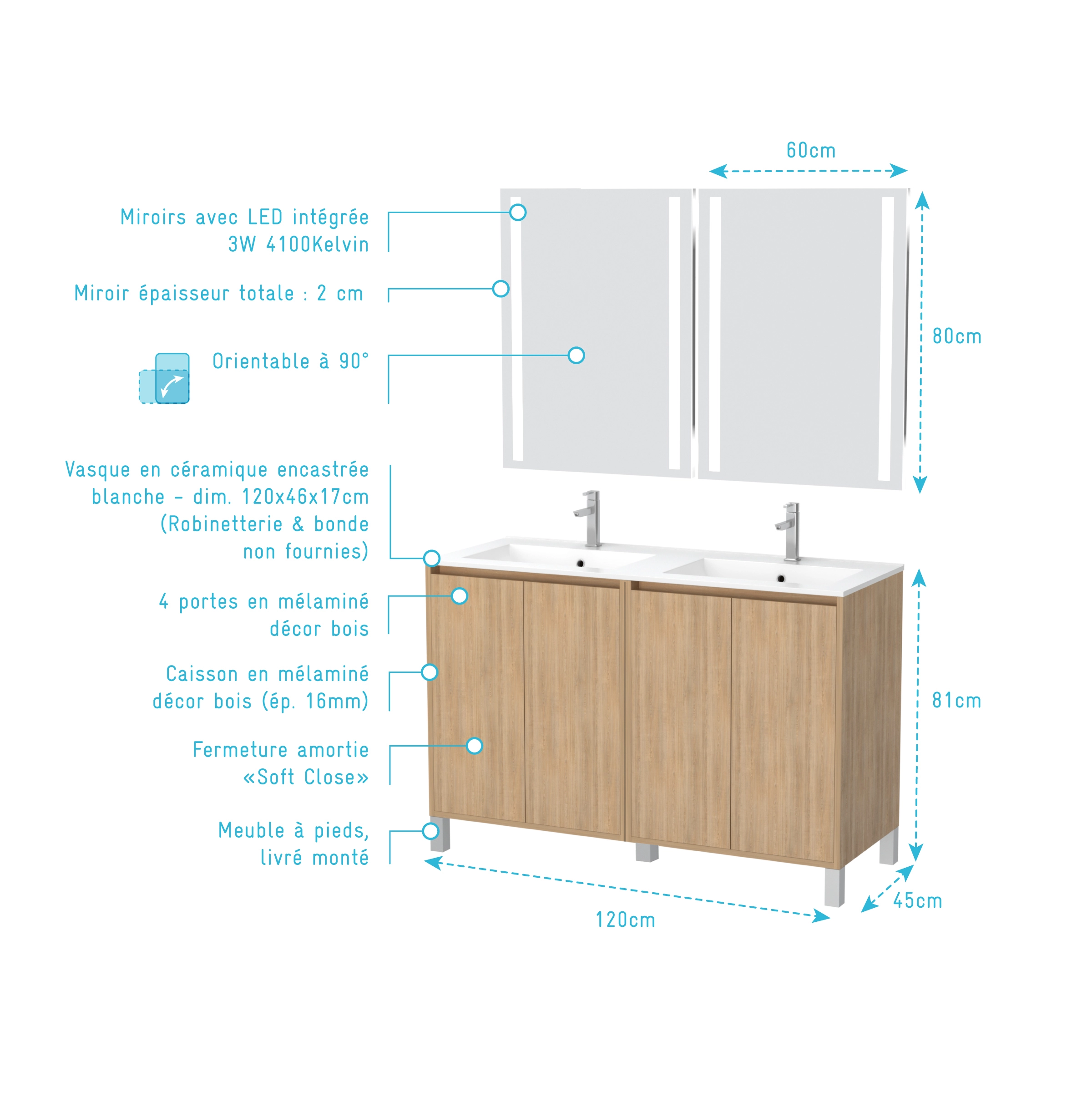 Meuble Salle de Bains 120 cm Chêne Clair 4 Portes, Vasque, Miroirs 60×80 à Leds intégrées – XENOS