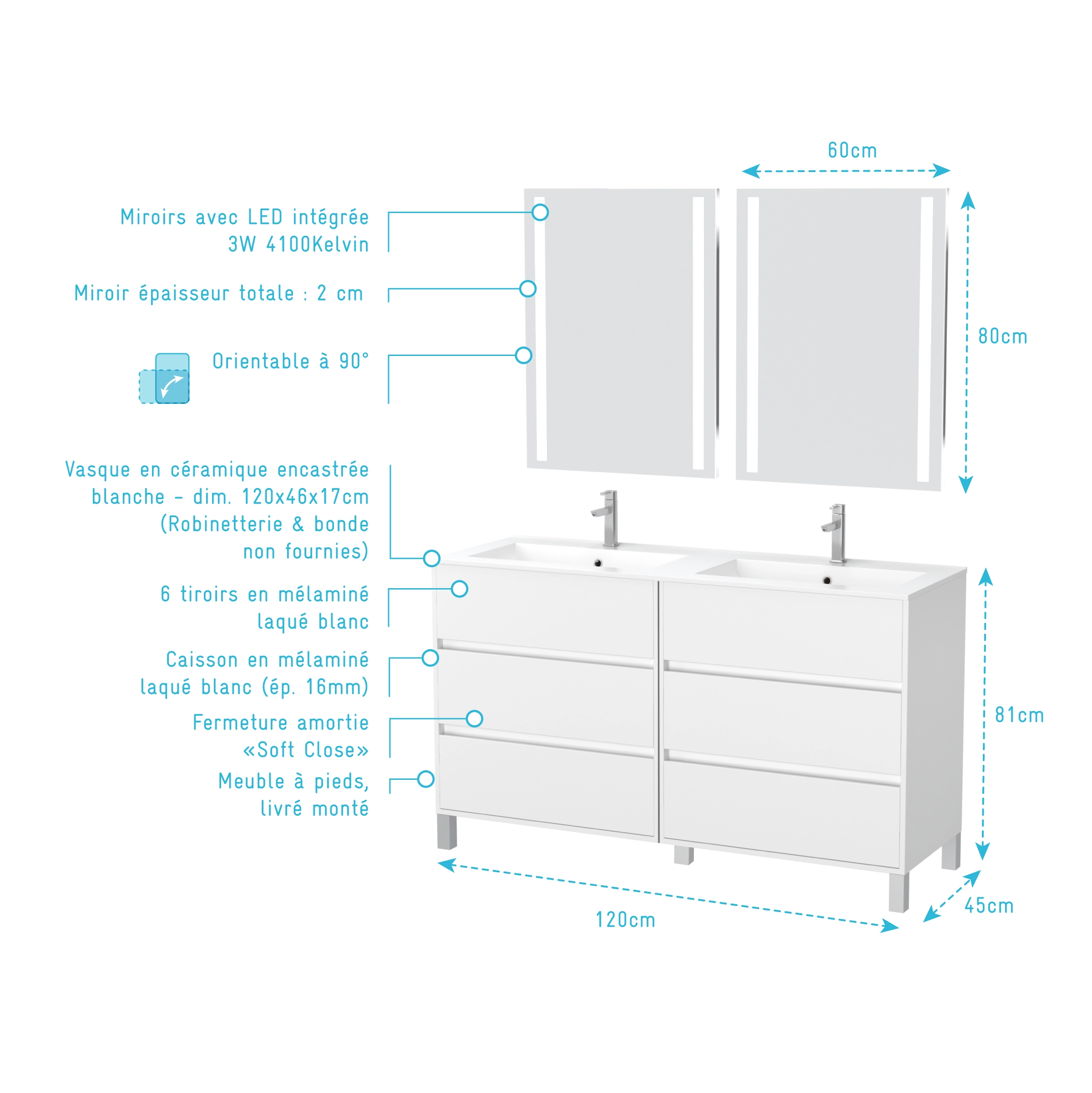 Meuble Salle de Bains 120 cm Laqué Blanc 6 Tiroirs, Vasque, Miroirs 60×80 à Leds intégrées – XENOS