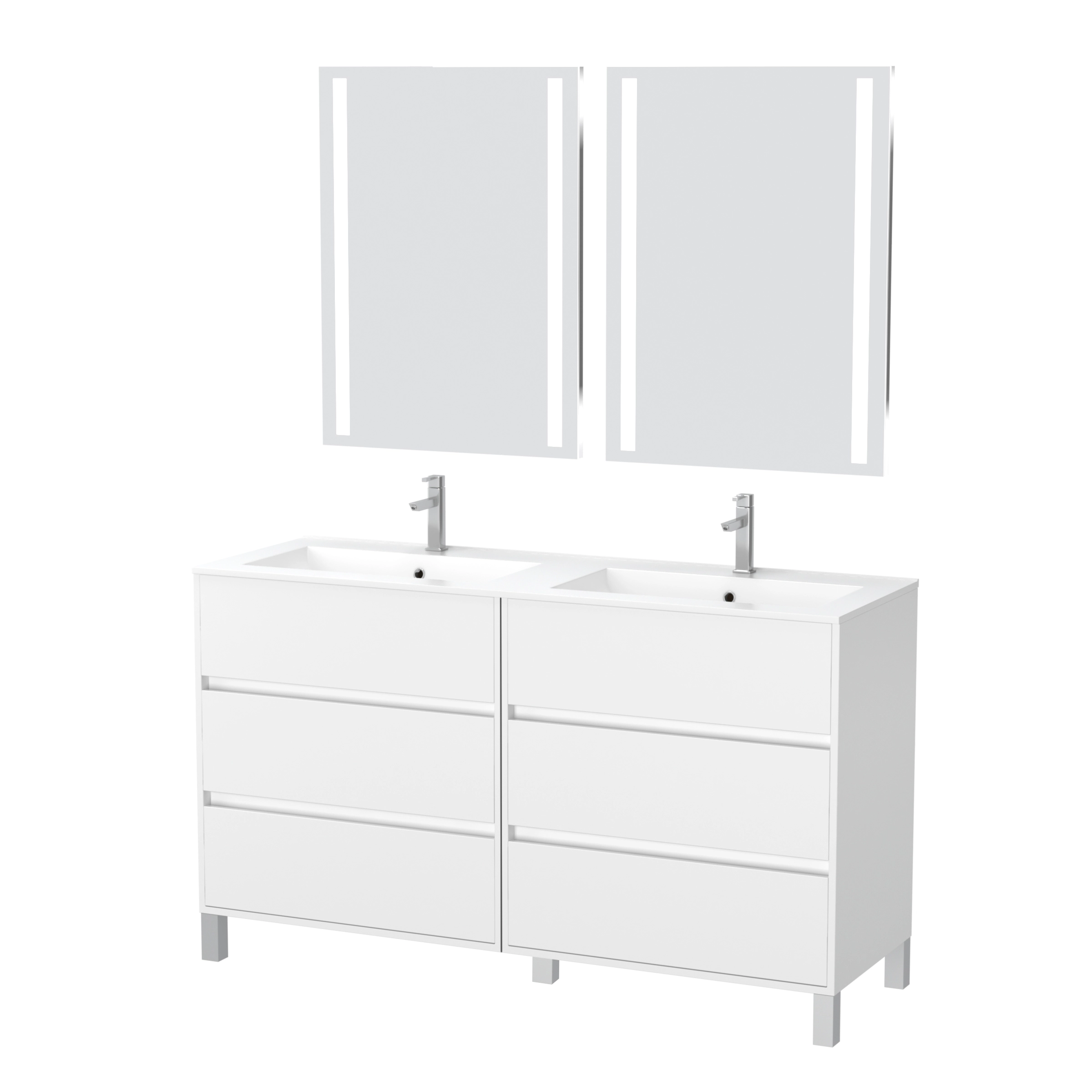 Modernisez votre salle de bain avec cet ensemble meuble équipé de 6 tiroirs, d’une double vasque en céramique blanche et de 2 miroirs à éclairage Led.