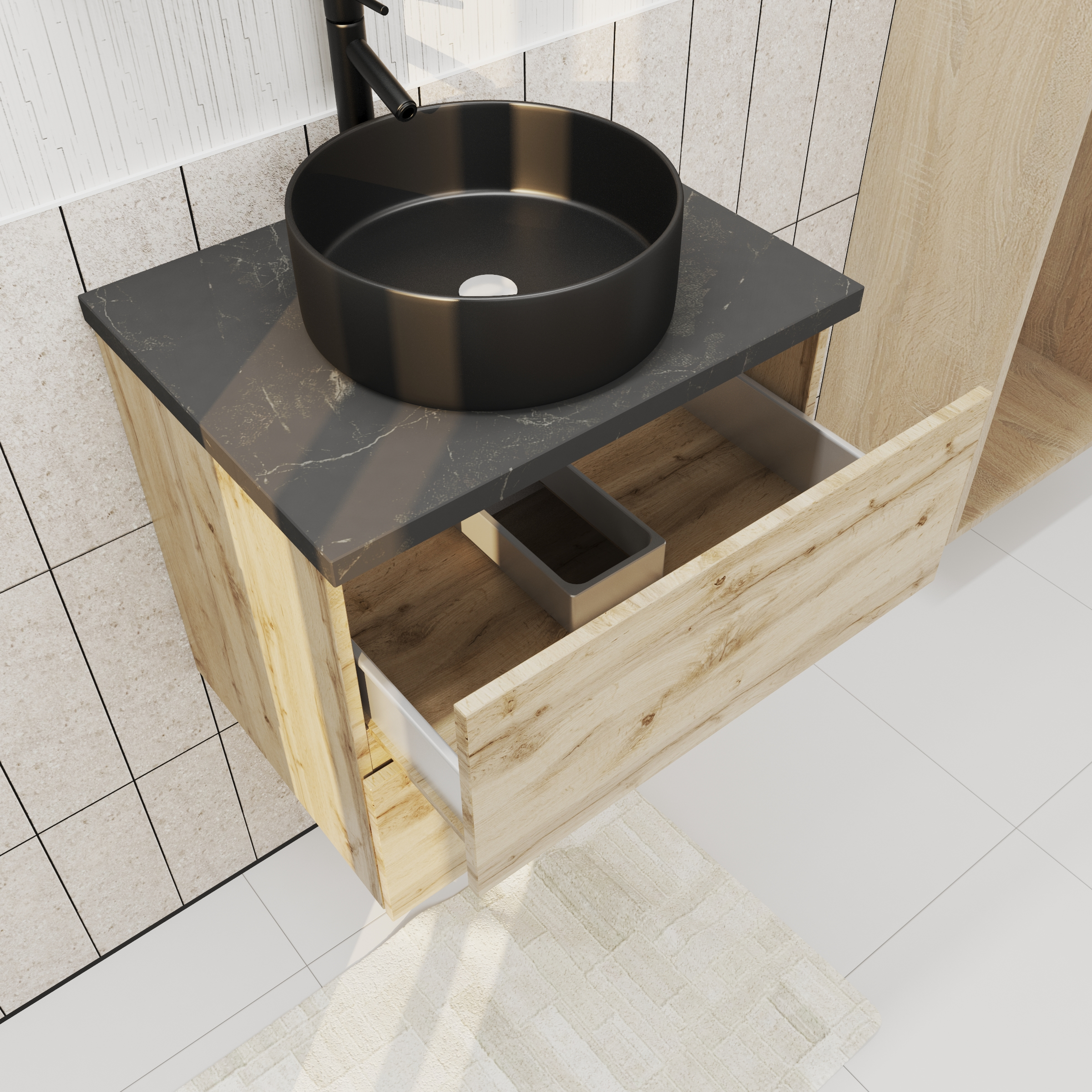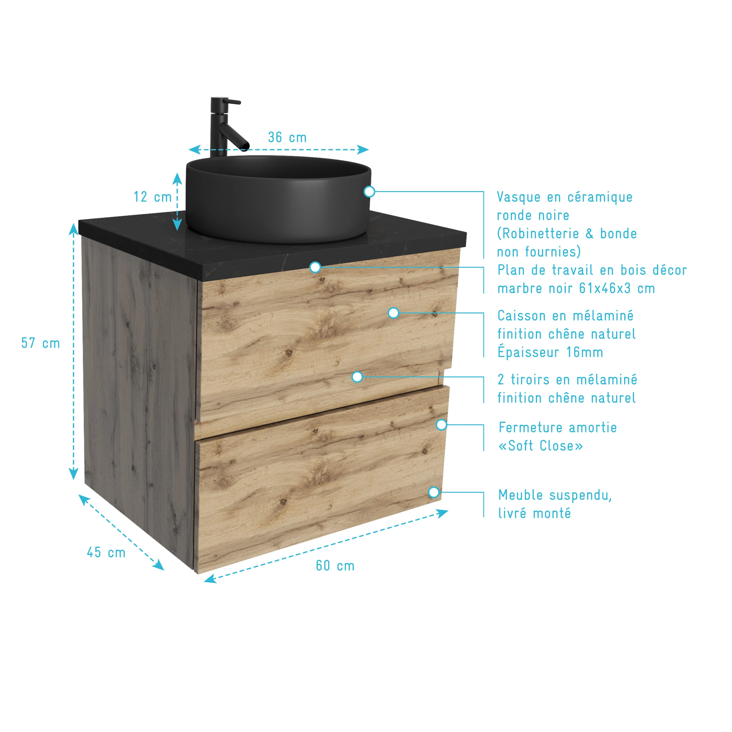 La vasque ronde noire vient parfaire l’ensemble, ajoutant une touche de sophistication à l’esthétique du plan de travail en bois effet marbre, créant ainsi une harmonie visuelle et fonctionnelle dans votre espace.
