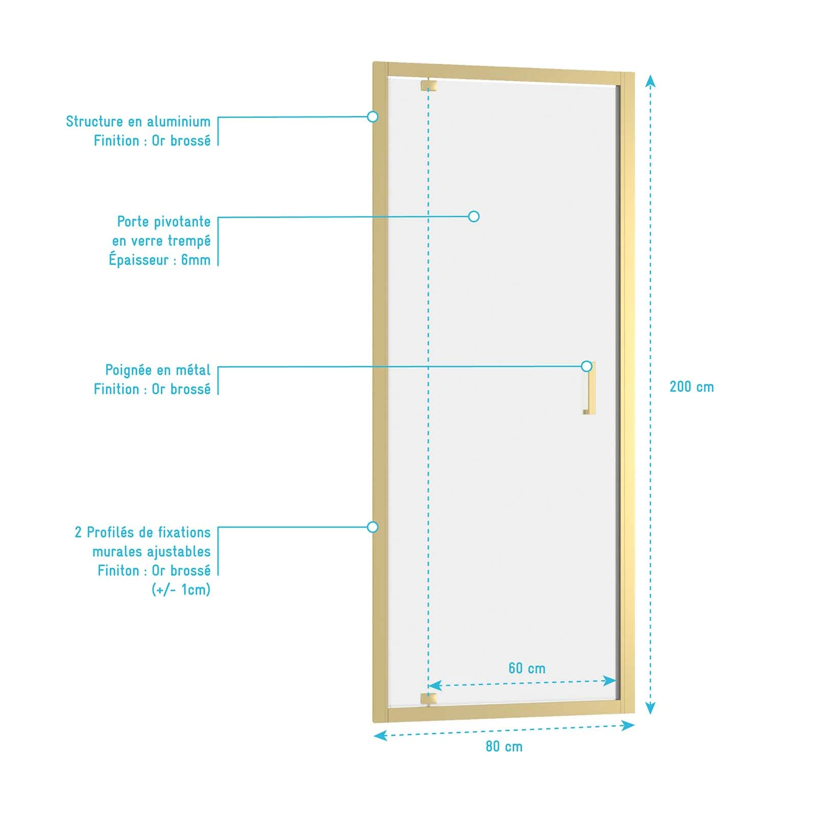 Porte de douche Pivotante 80x200cm – Profilés Or Doré Brossé – Verre Trempé 6mm – GOLDY CRUSH