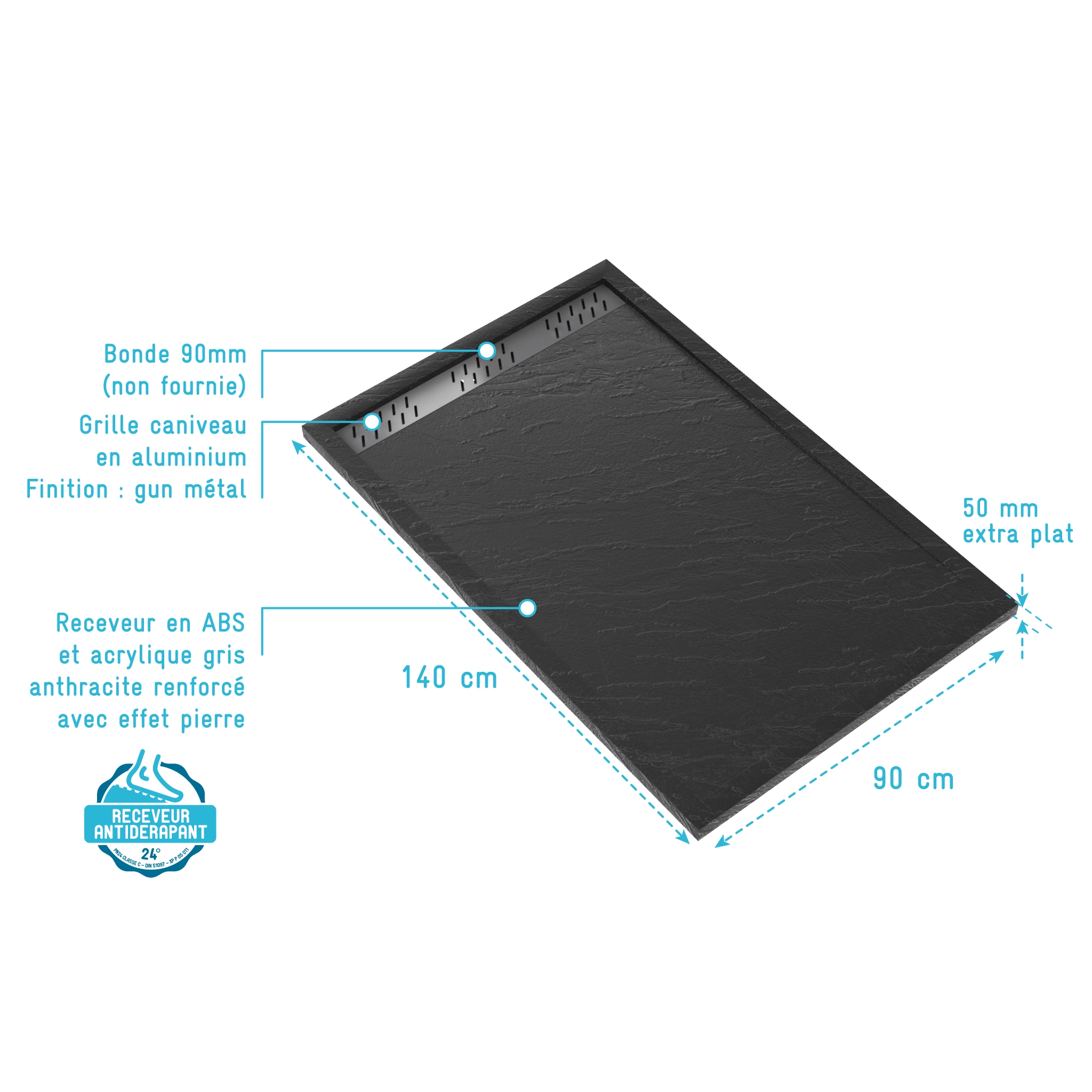 Receveur en acrylique Gris Effet Pierre 90x140x5cm + Grilles Linéaires Chrome et Gun Metal – METEORA