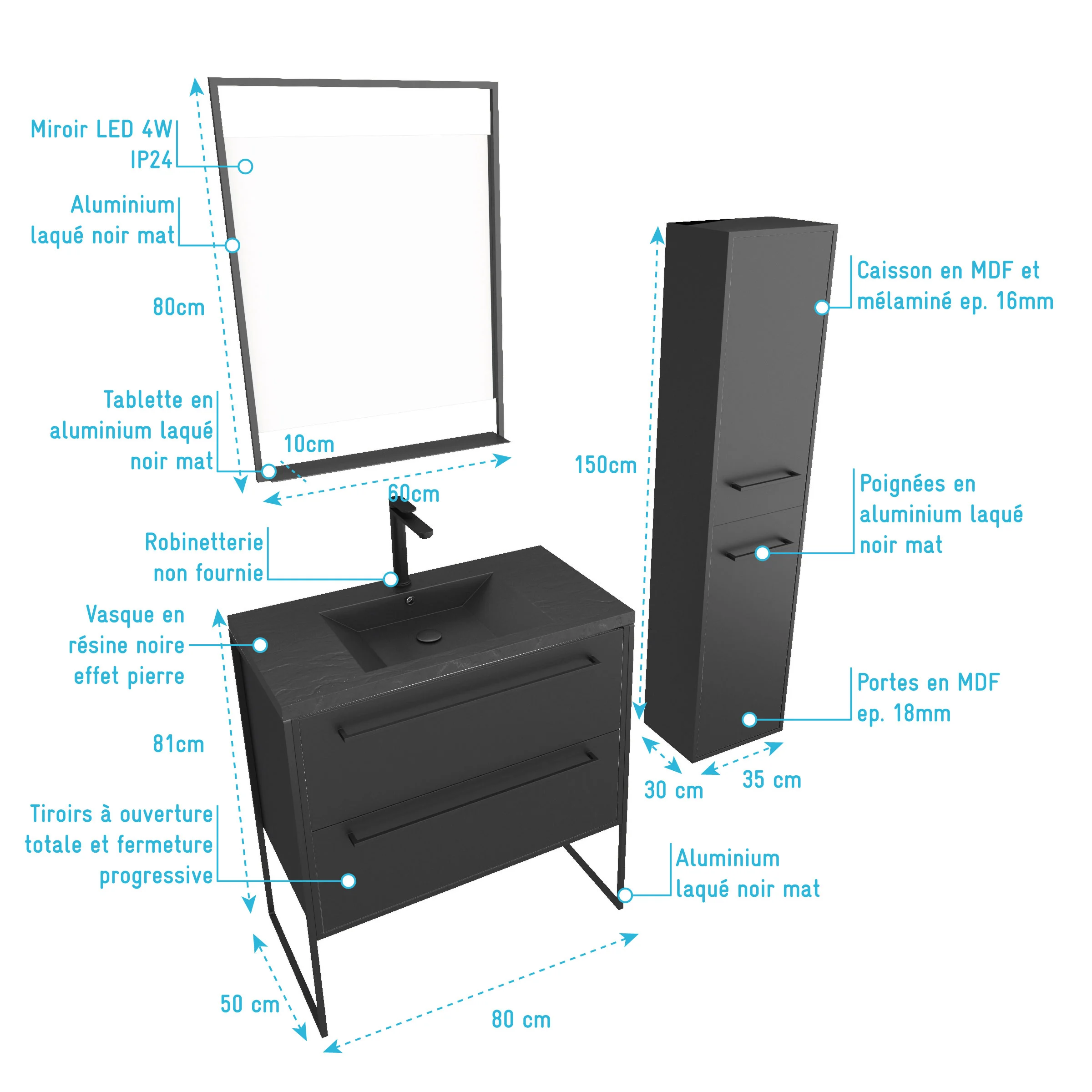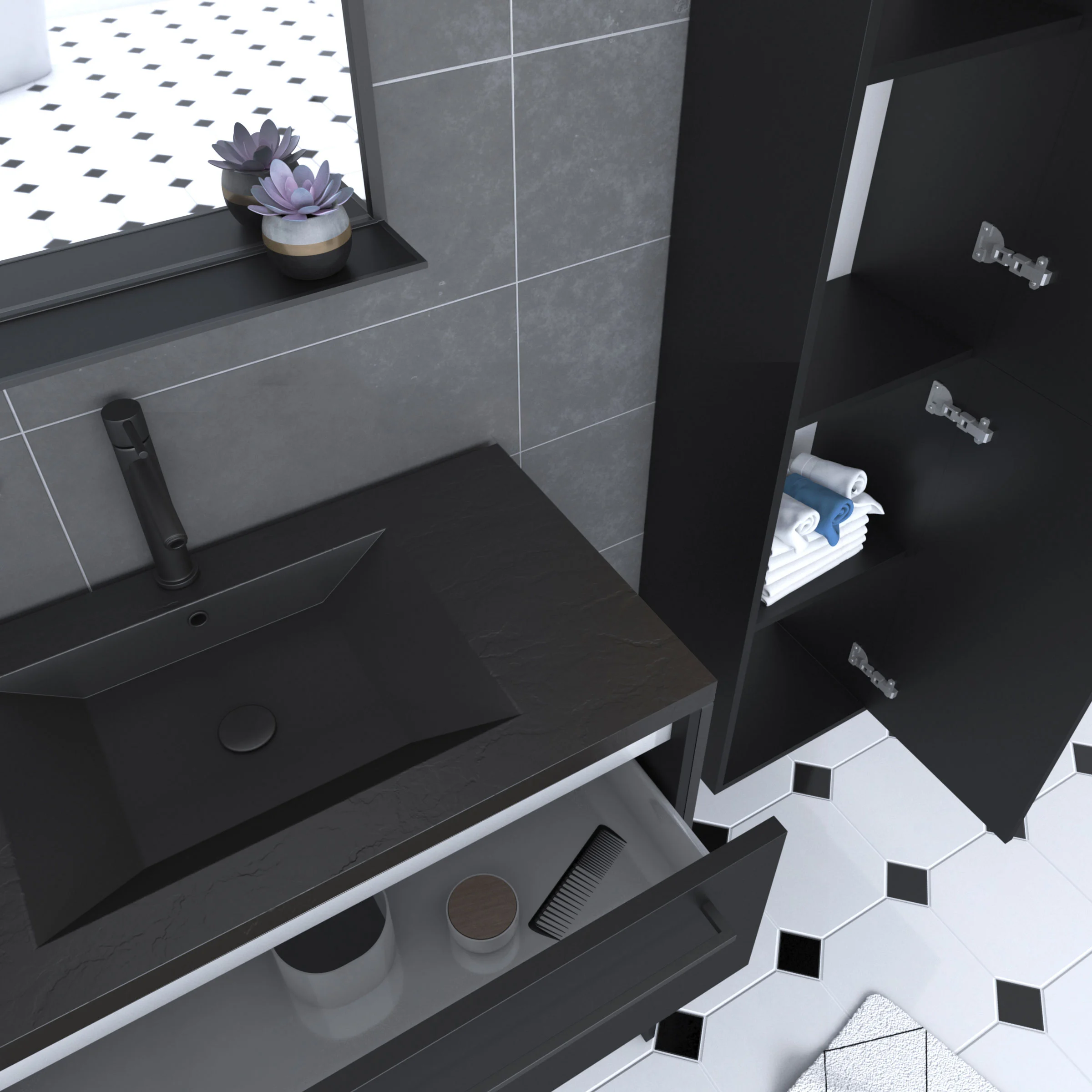 Meuble Salle de Bains 80 cm, Vasque Noire, Miroir Led et Colonne – Noir – STRUCTURA