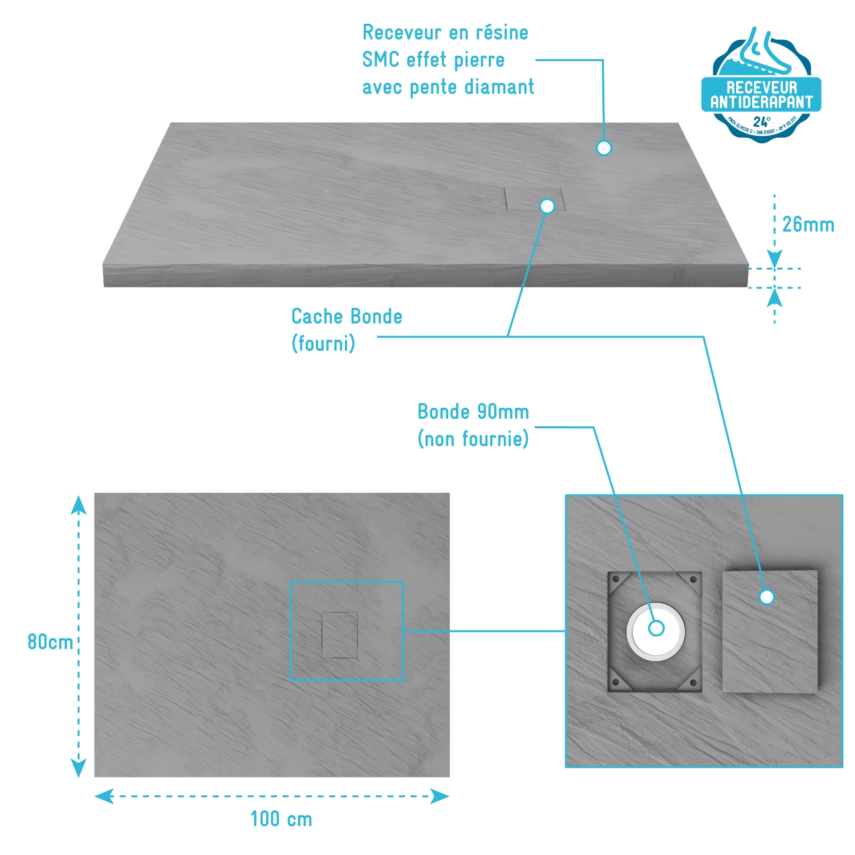13 avis pour Receveur à poser en matériaux composite SMC – Finition ardoise gris – 80x100cm – ROCK 2 GREY 80