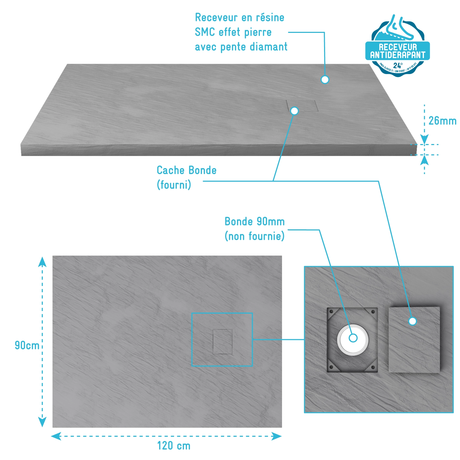 14 avis pour Receveur à poser en matériaux composite SMC – Finition ardoise gris – 90x120cm – ROCK 2 GREY 90