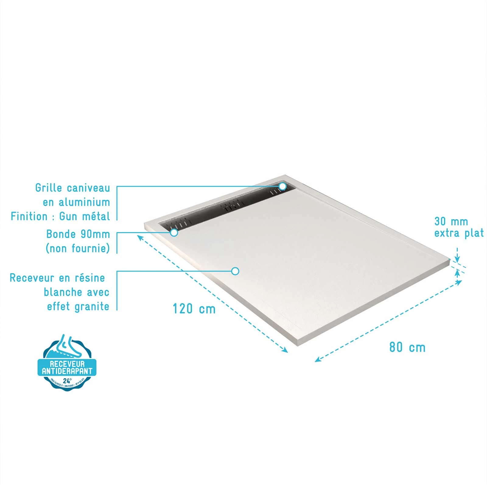 • Receveur de douche en résine blanc 80x120x3 cm effet pierre granit + grille linéaire gun métal