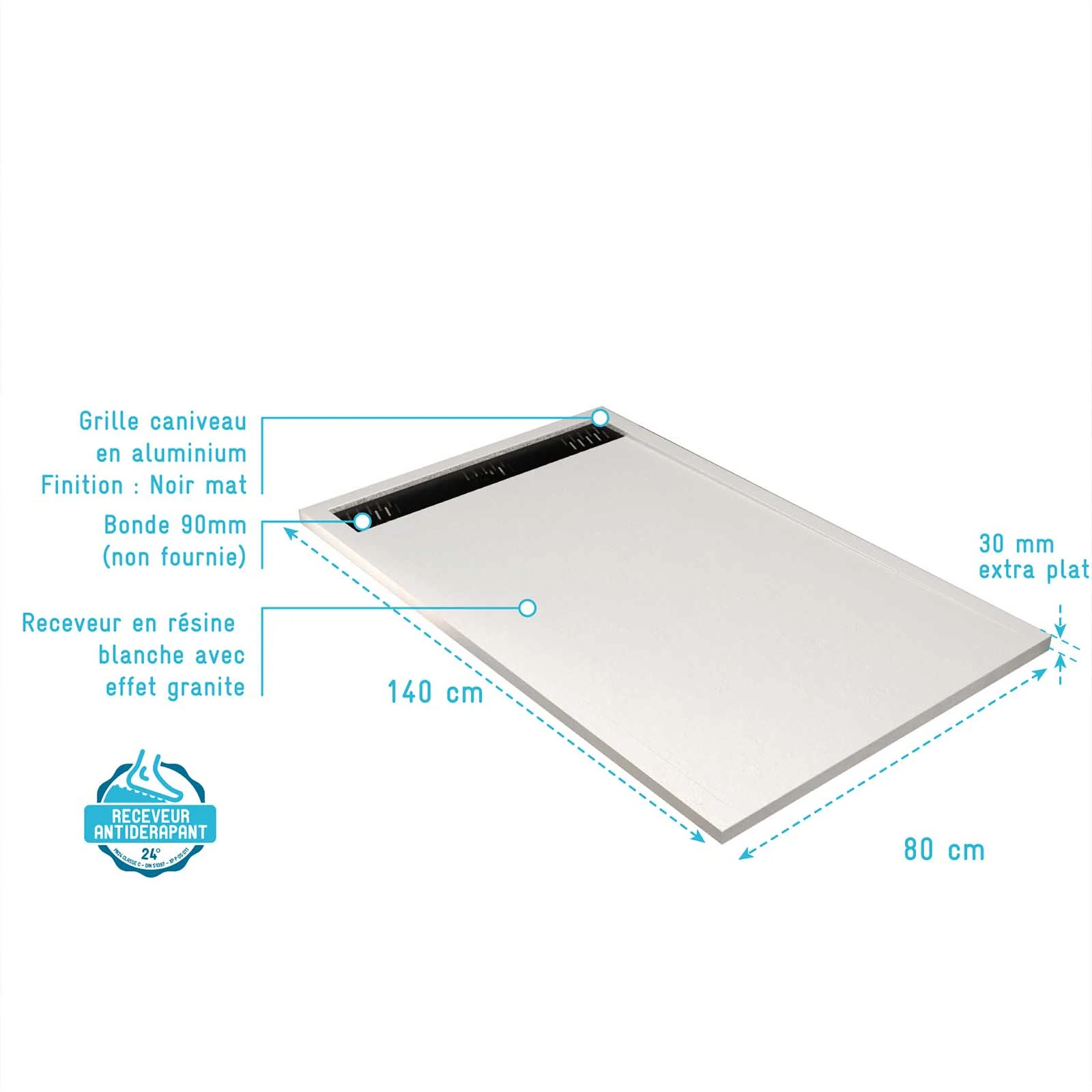 Receveur de douche en résine blanc 80x140x3 cm effet pierre granit + grille linéaire noire mate