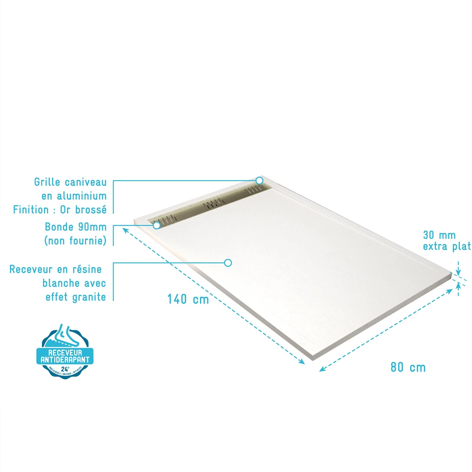 • Receveur de douche en résine blanc 80x140x3 cm effet pierre granit + grille linéaire or brossé