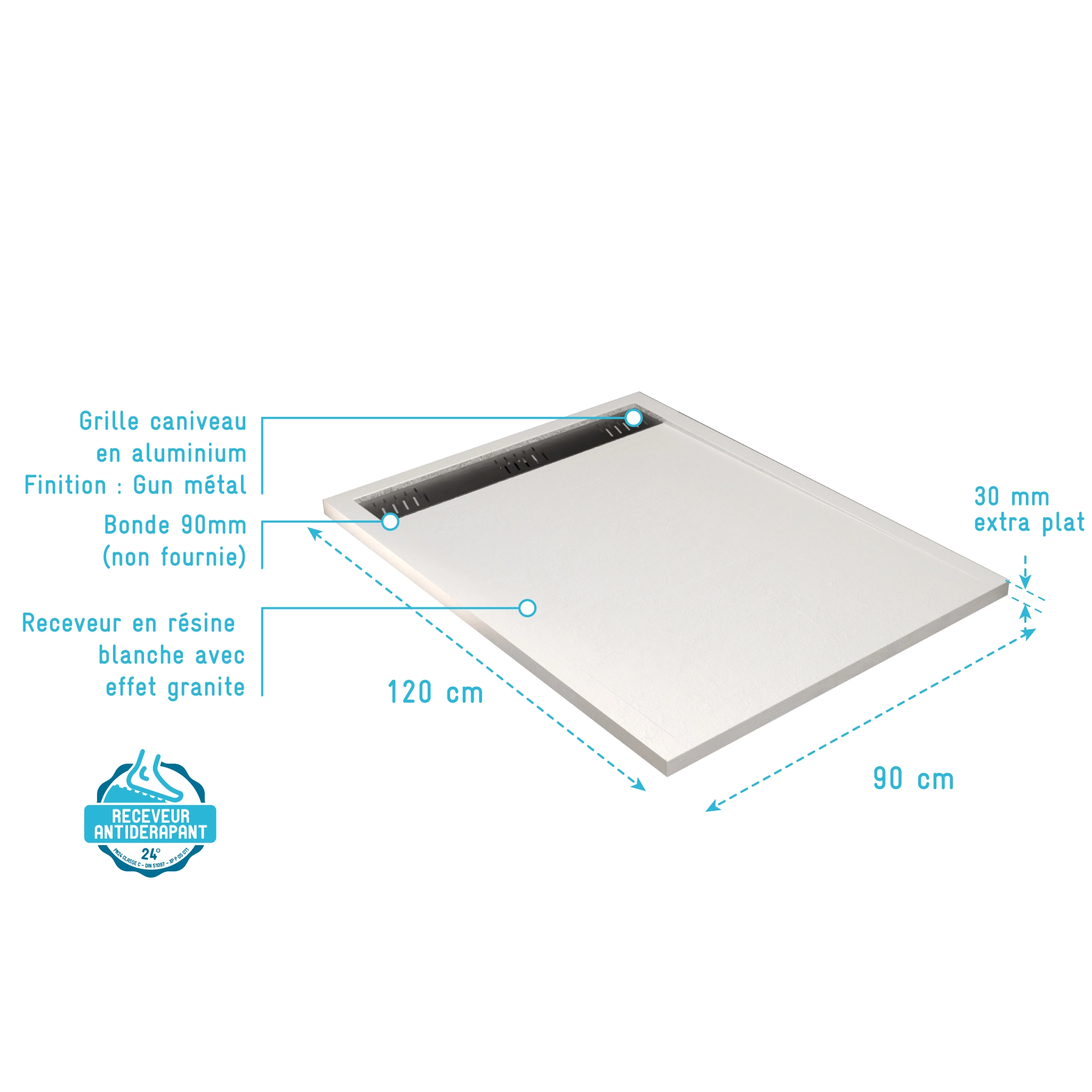• Receveur de douche en résine blanc 90x120x3 cm effet pierre granit + grille linéaire gun metal