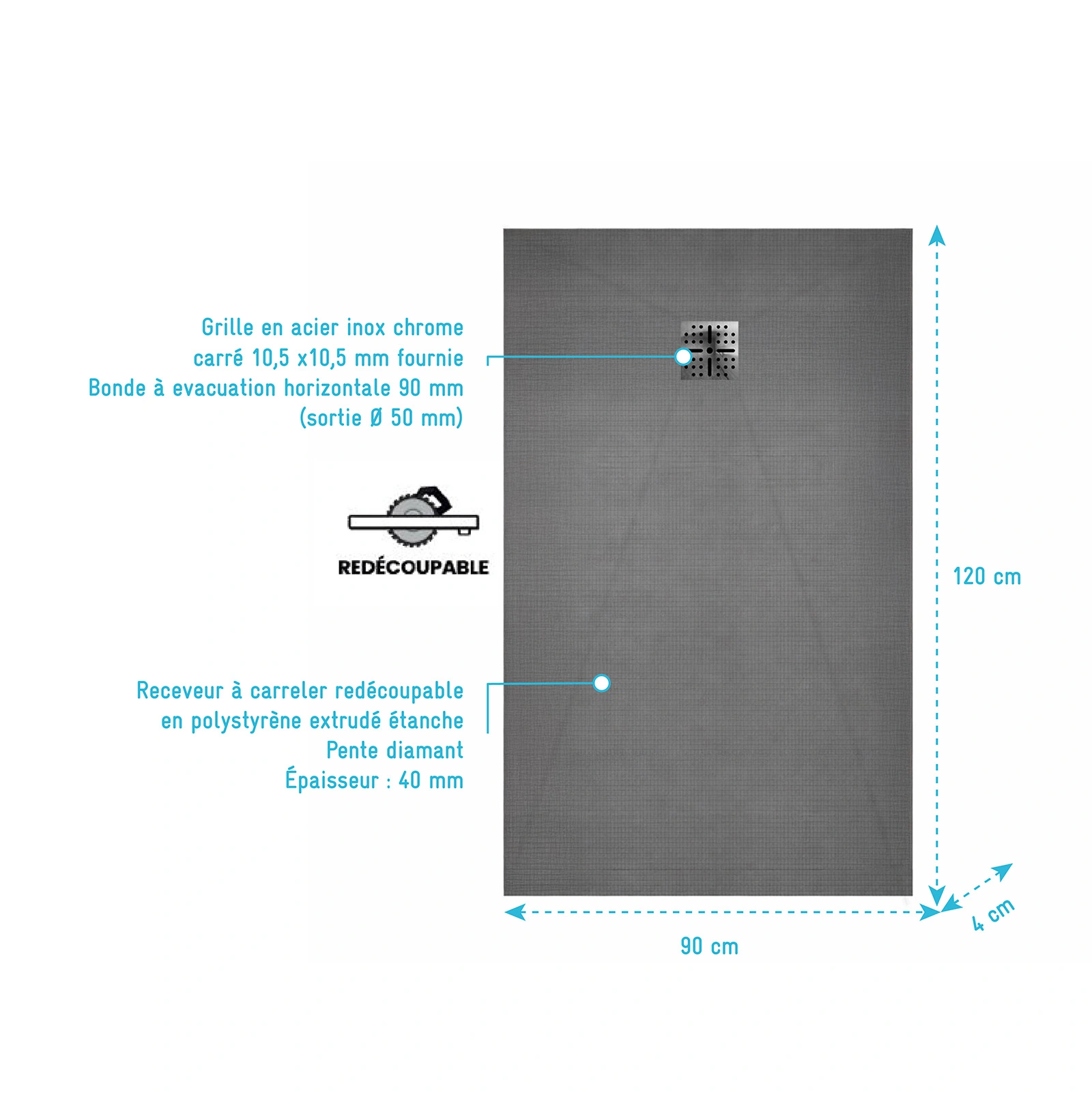 Ce receveur à carreler permet de créer une douche à l’italienne personnalisée avec le carrelage de votre choix. Bonde à sortie Horizontale – Grille finition chrome fournie.