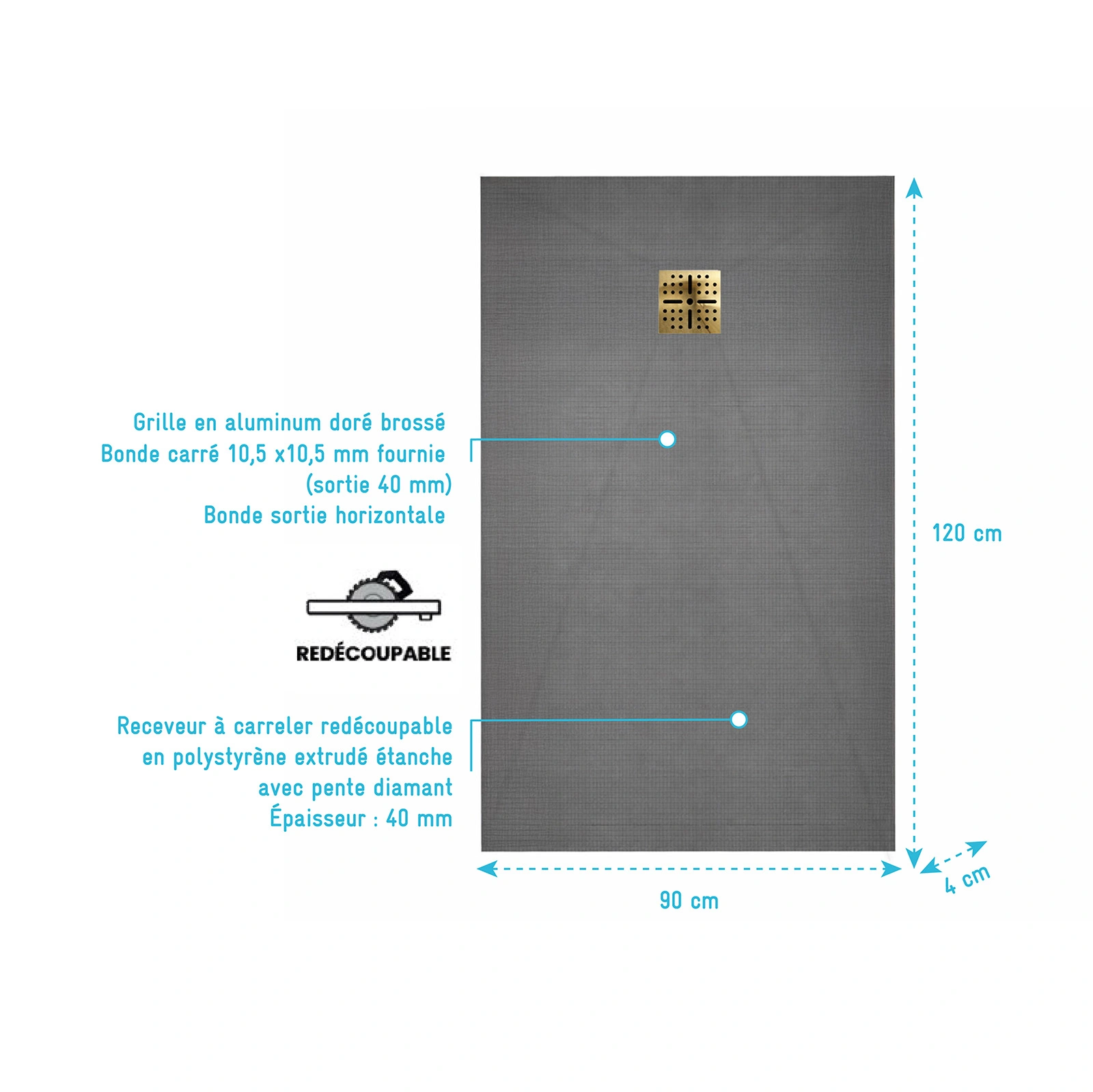 Receveur de douche à carreler 120×90 cm avec bonde écoulement linéaire – Grille finition or brossé