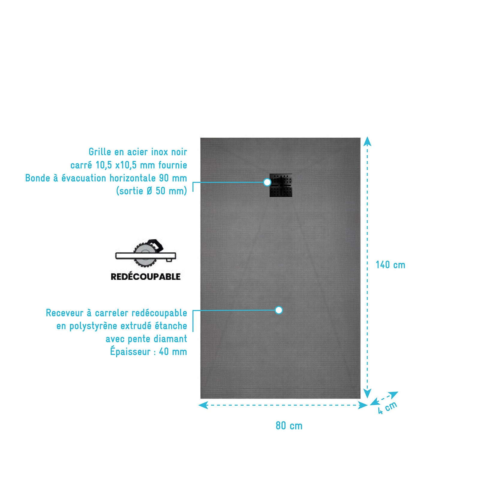 Ce receveur à carreler permet de créer une douche à l’italienne personnalisée avec le carrelage de votre choix. Inclus une bonde à sortie Horizontale et une grille noire.