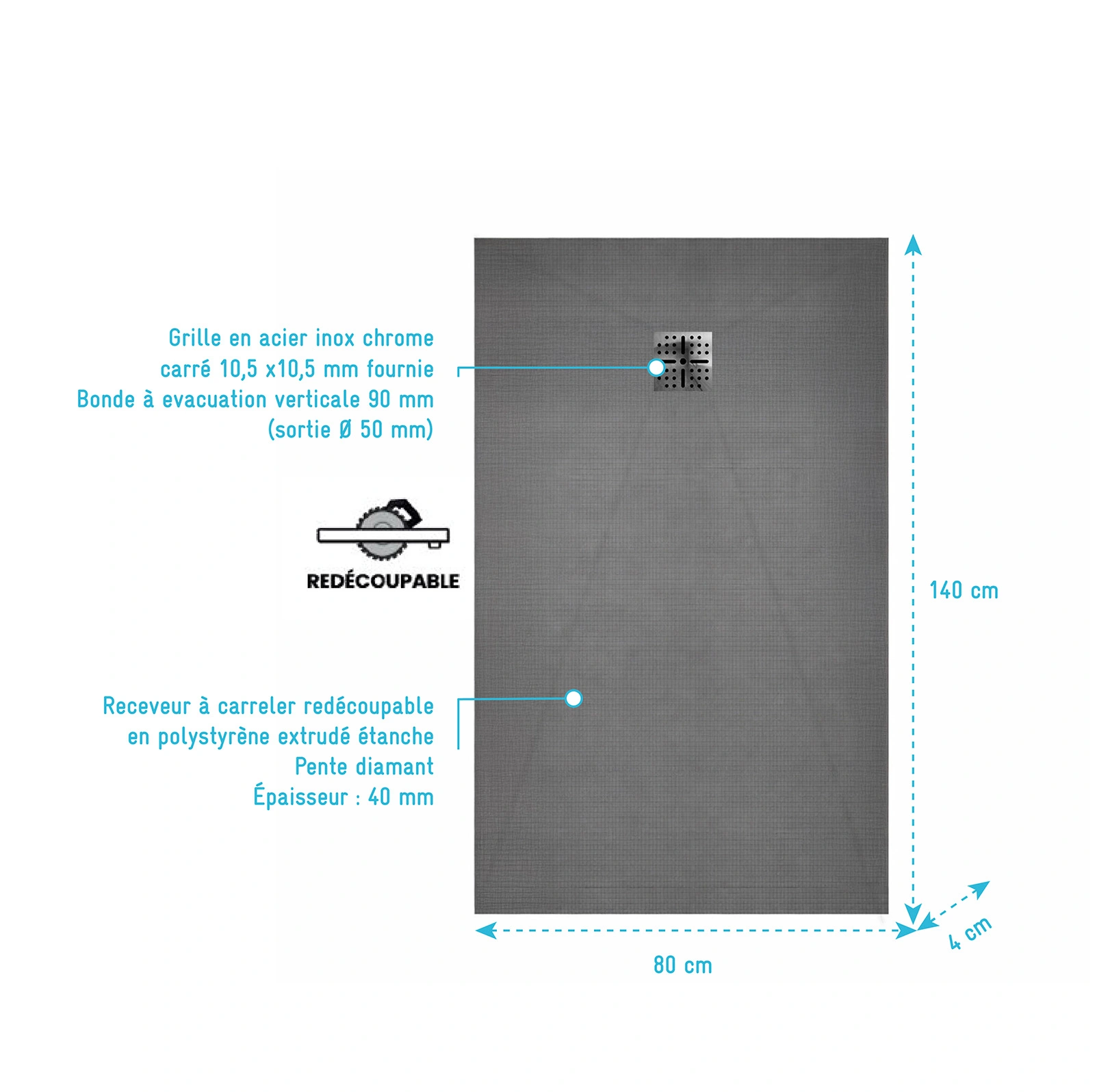 Receveur de Douche à Carreler 140x80cm avec Bonde à Sortie Verticale – Grille Inox Chrome