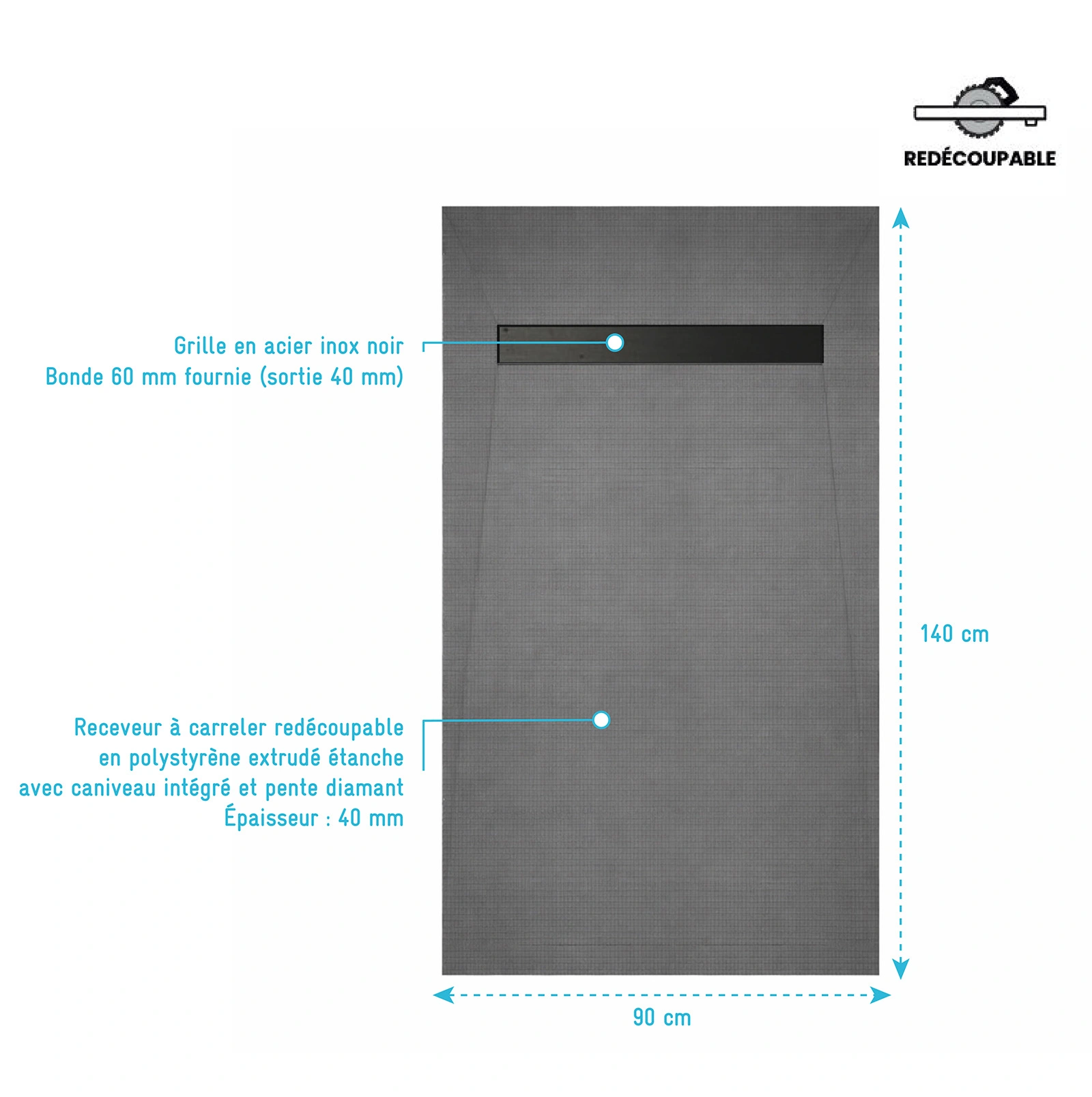 Fabriqué en polystyrène extrudé (XPS), il est naturellement hydrofuge, léger, simple à transporter et compatible avec tout type de colle à carrelage. Sa pente diamant assure une évacuation optimale de l’eau.