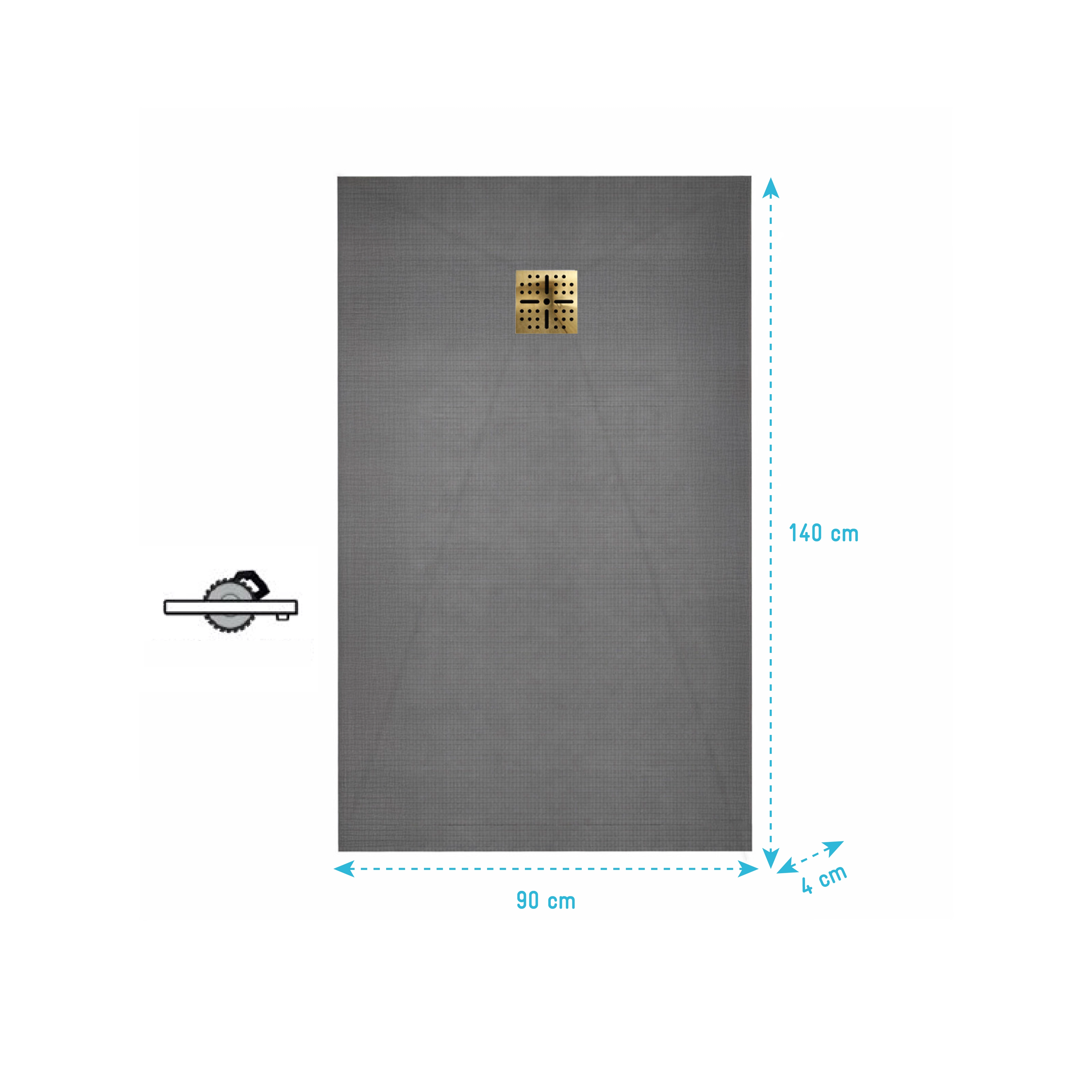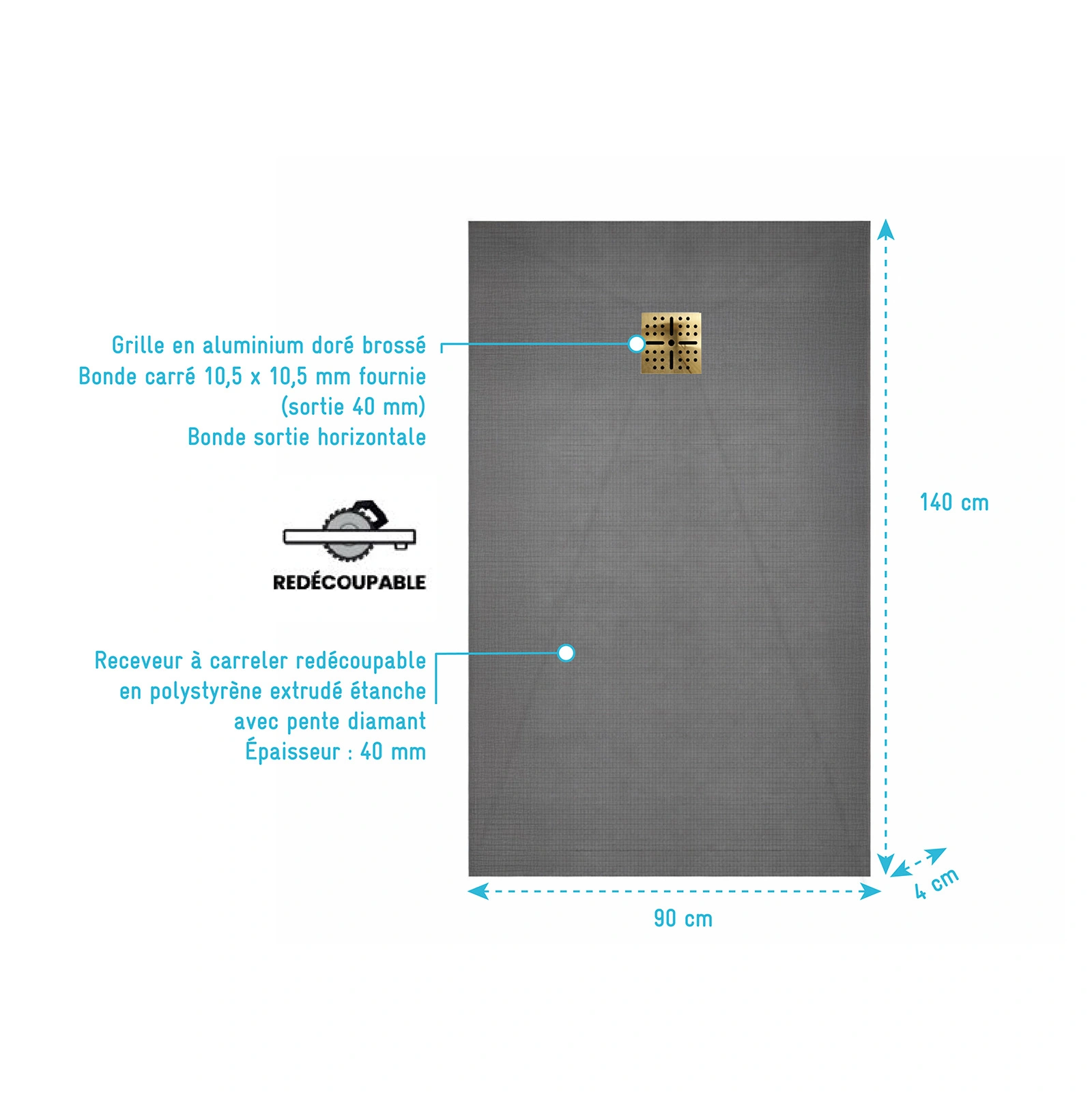 Receveur de Douche à Carreler 140x90cm avec Bonde à Sortie Horizontale – Grille Finition Or Brossé