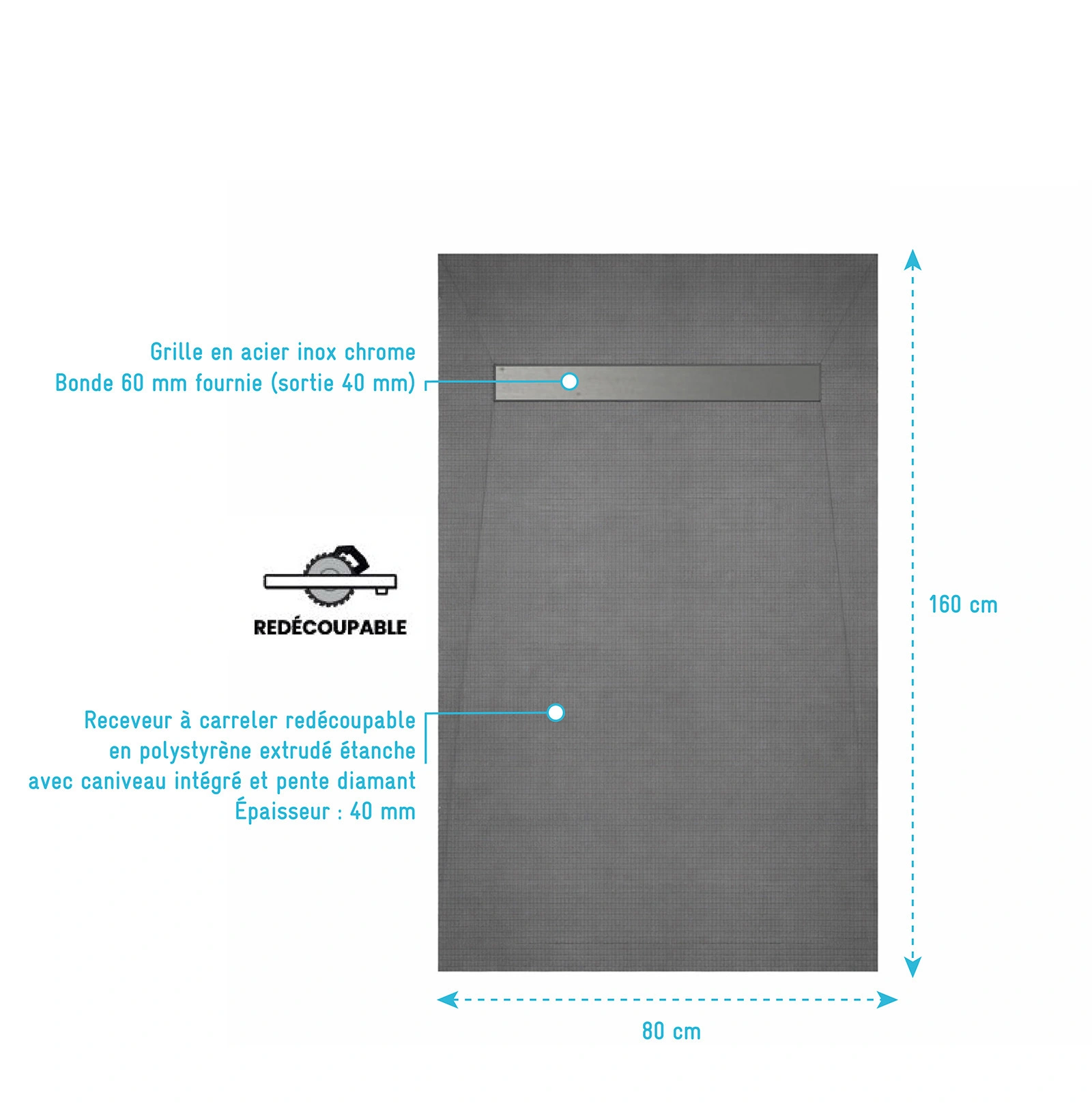 Receveur de douche à carreler 160×80 cm avec bonde écoulement linéaire – Grille finition chrome