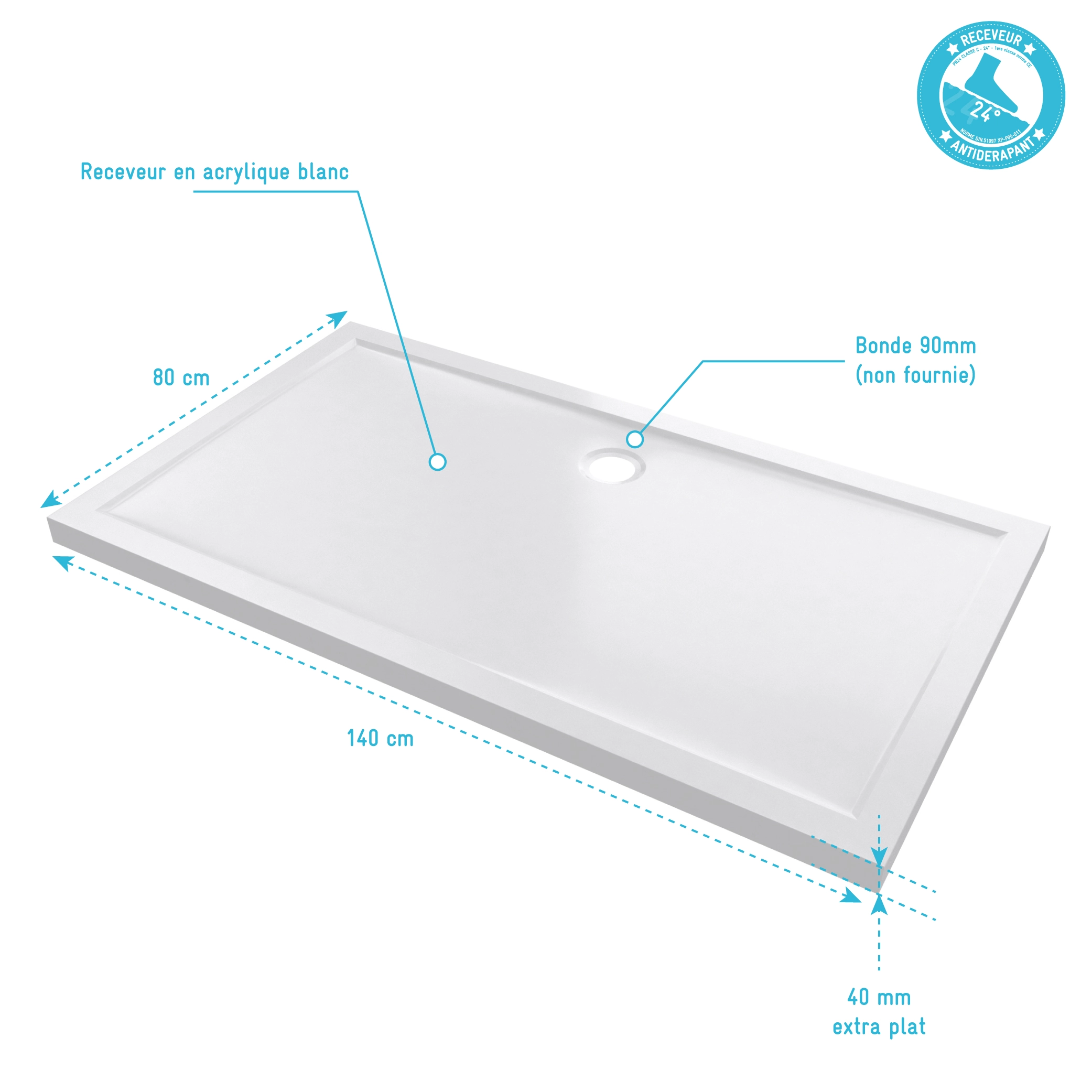 RECEVEUR DE DOUCHE A POSER EXTRA-PLAT EN ACRYLIQUE BLANC RECTANGLE – 140x80cm – BAC DE DOUCHE