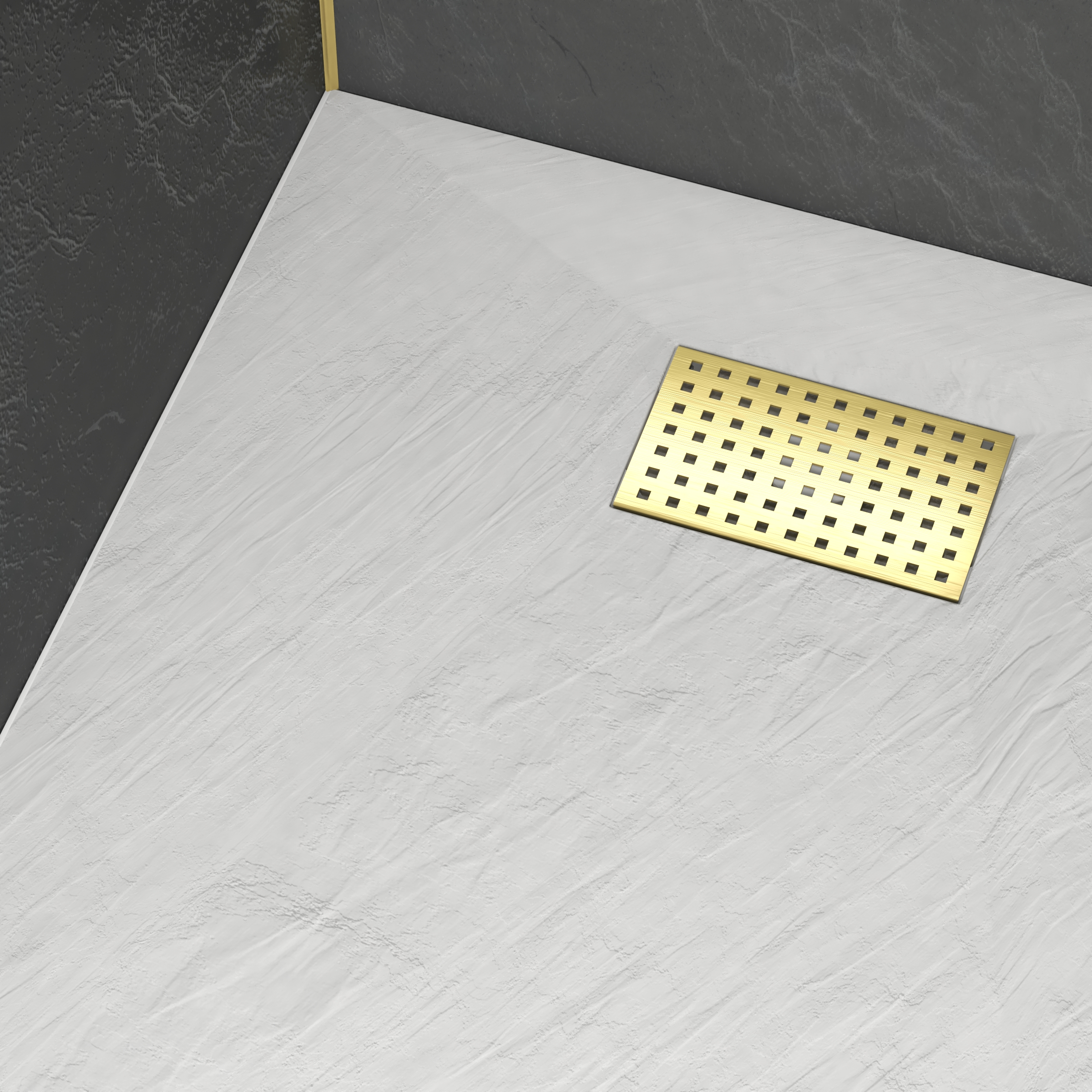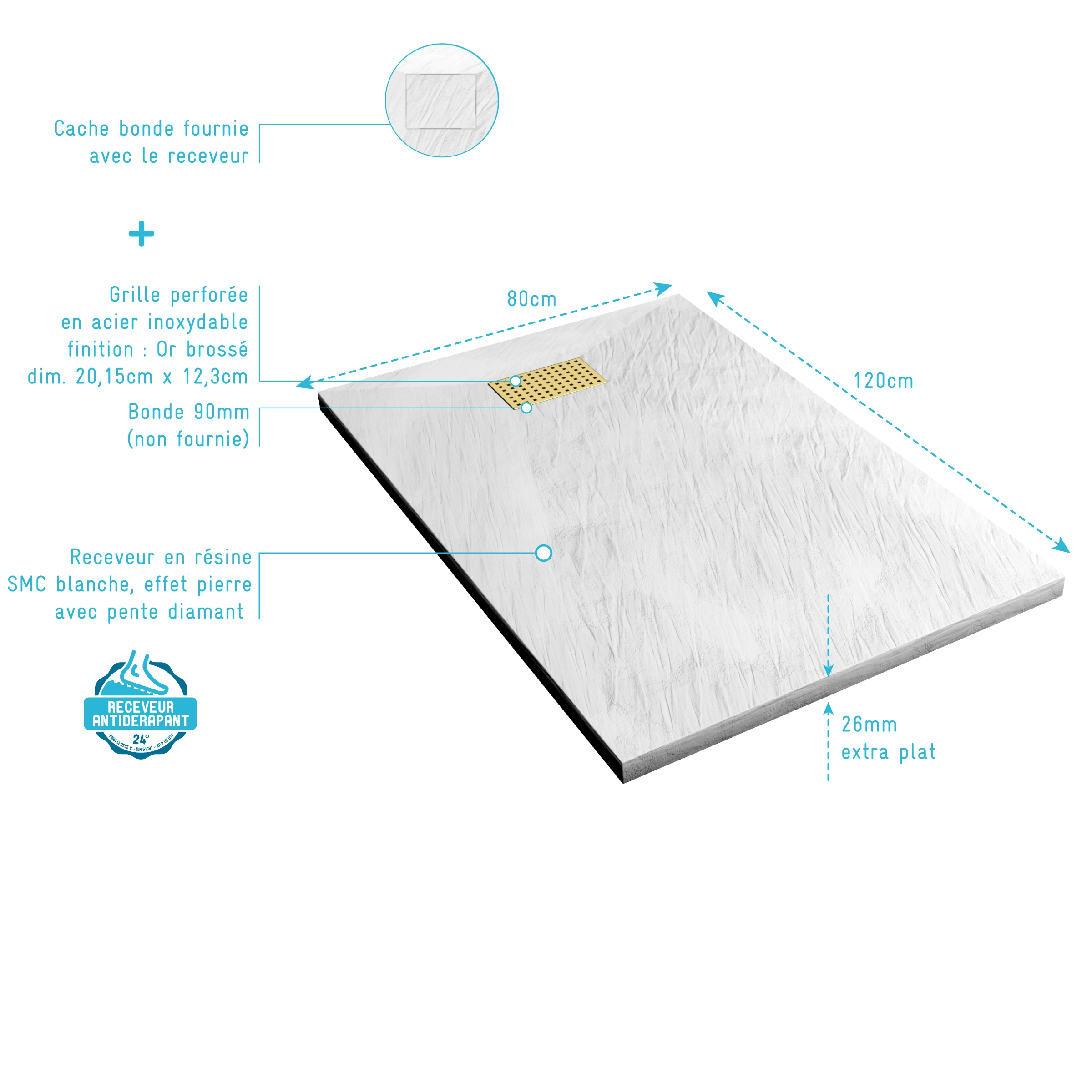 Receveur de douche Blanc Effet Pierre 80×120 cm et Grille décor Perforée Or Doré Brossé