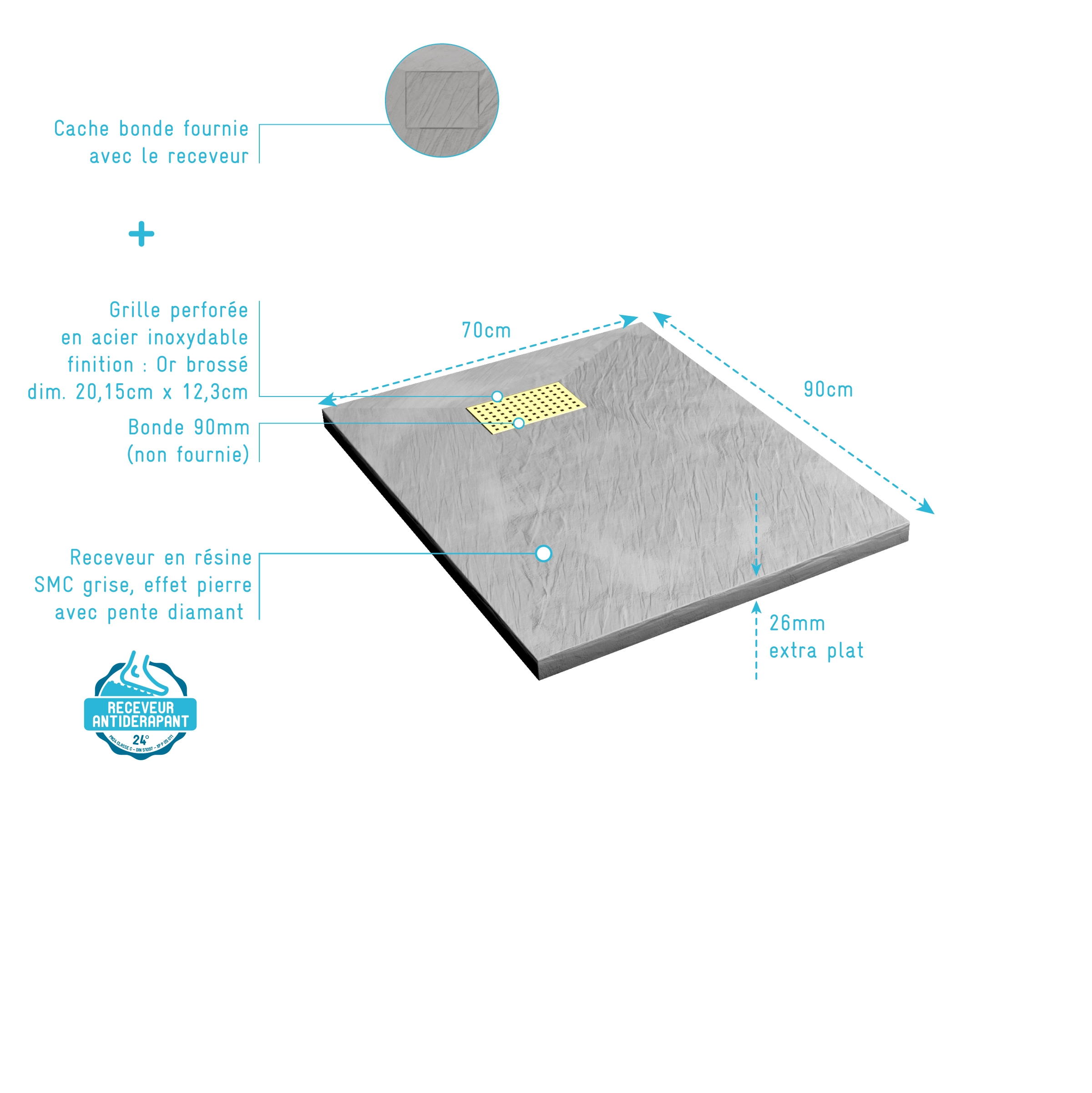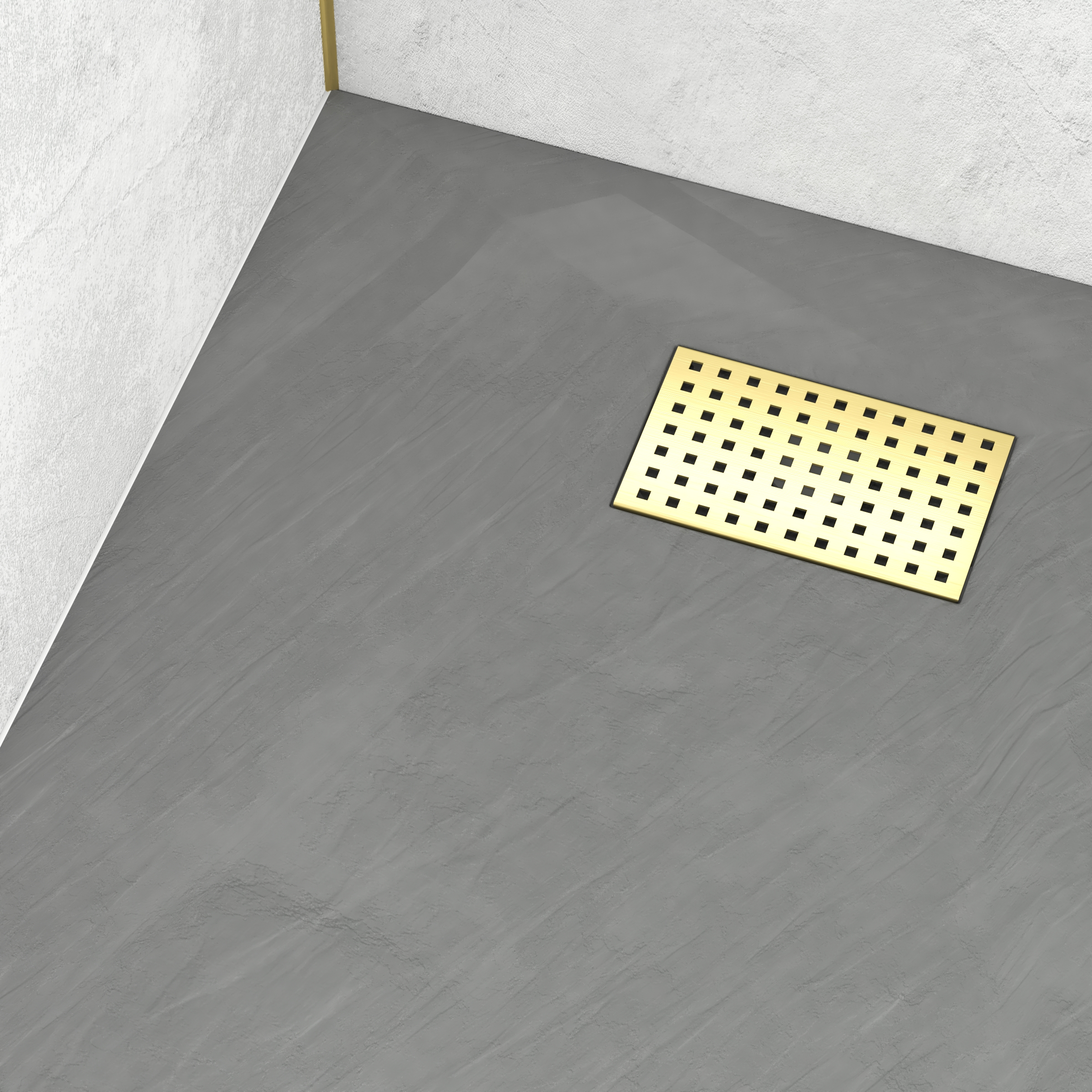 Receveur de douche Gris Effet Pierre 70×90 cm et Grille décor Perforée Or Doré Brossé
