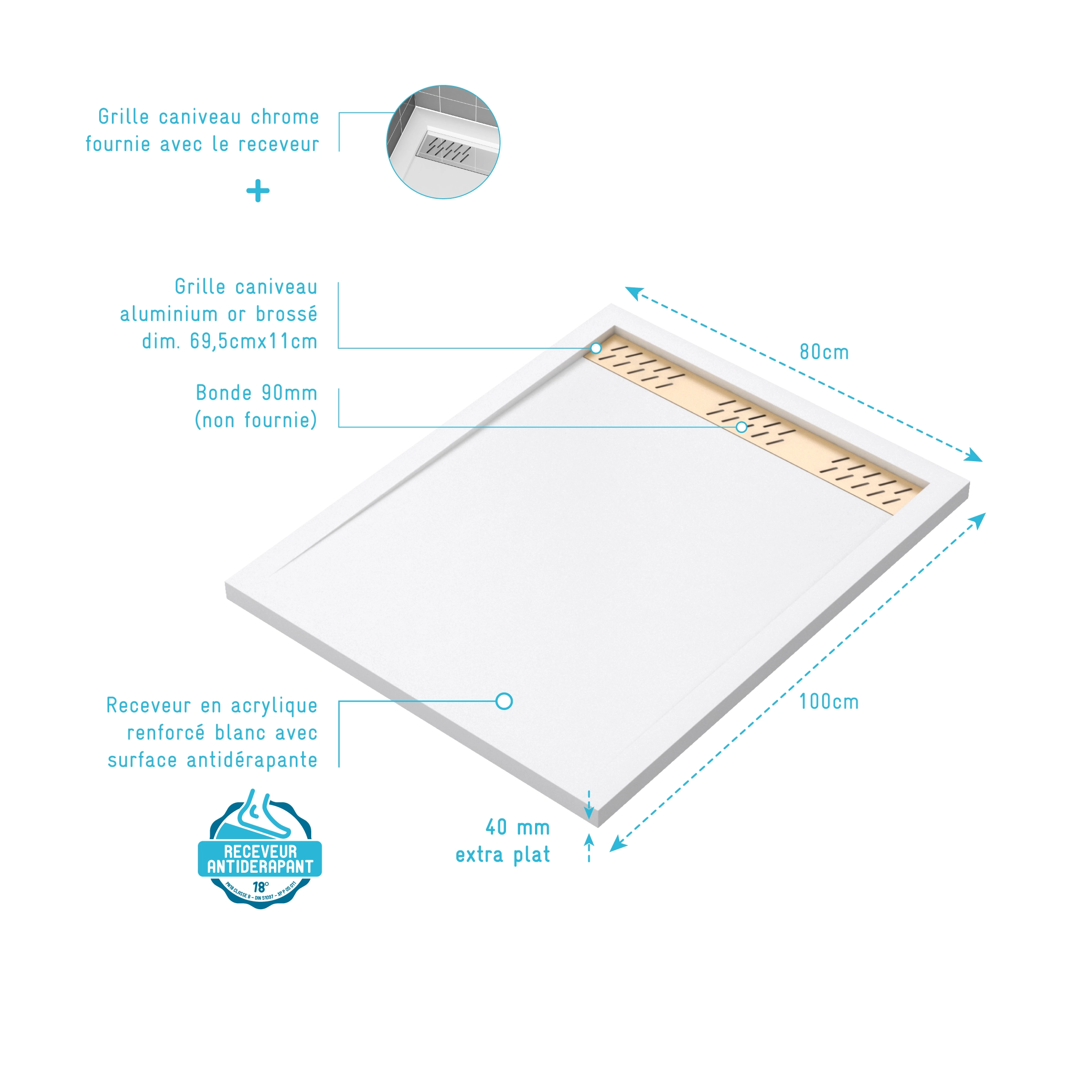Receveur en acrylique Blanc 80x100x4 cm + Grilles Linéaires Chrome et Or Brossé – WHITENESS II