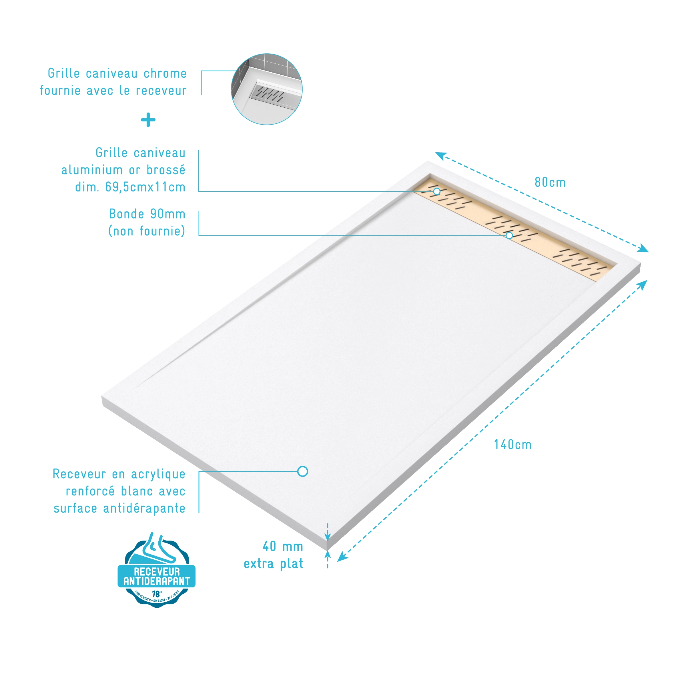 Receveur en acrylique Blanc 80x140x5 cm + Grilles Linéaires Chrome et Or Brossé – WHITENESS II
