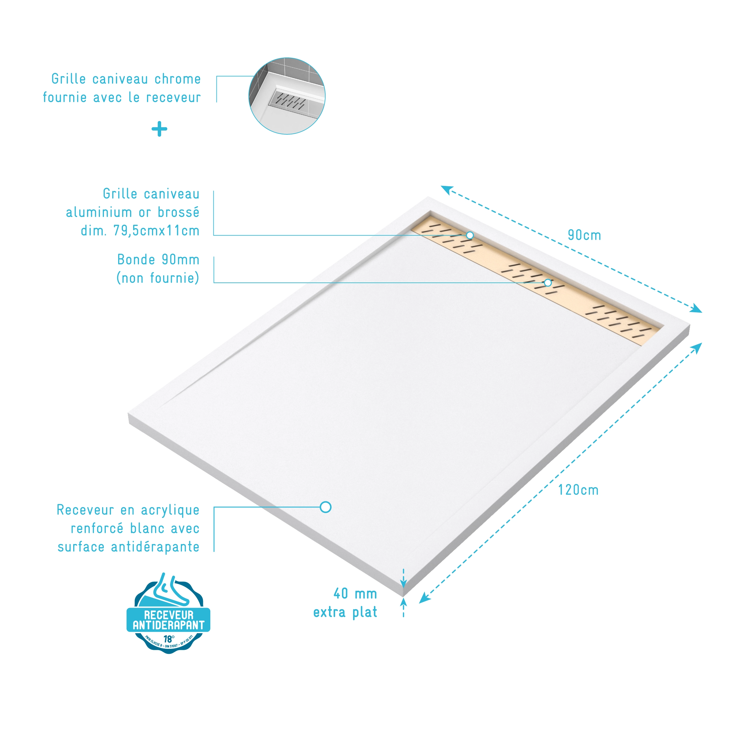 Receveur en acrylique Blanc 90x120x4 cm + Grilles Linéaires Chrome et Or Brossé – WHITENESS II