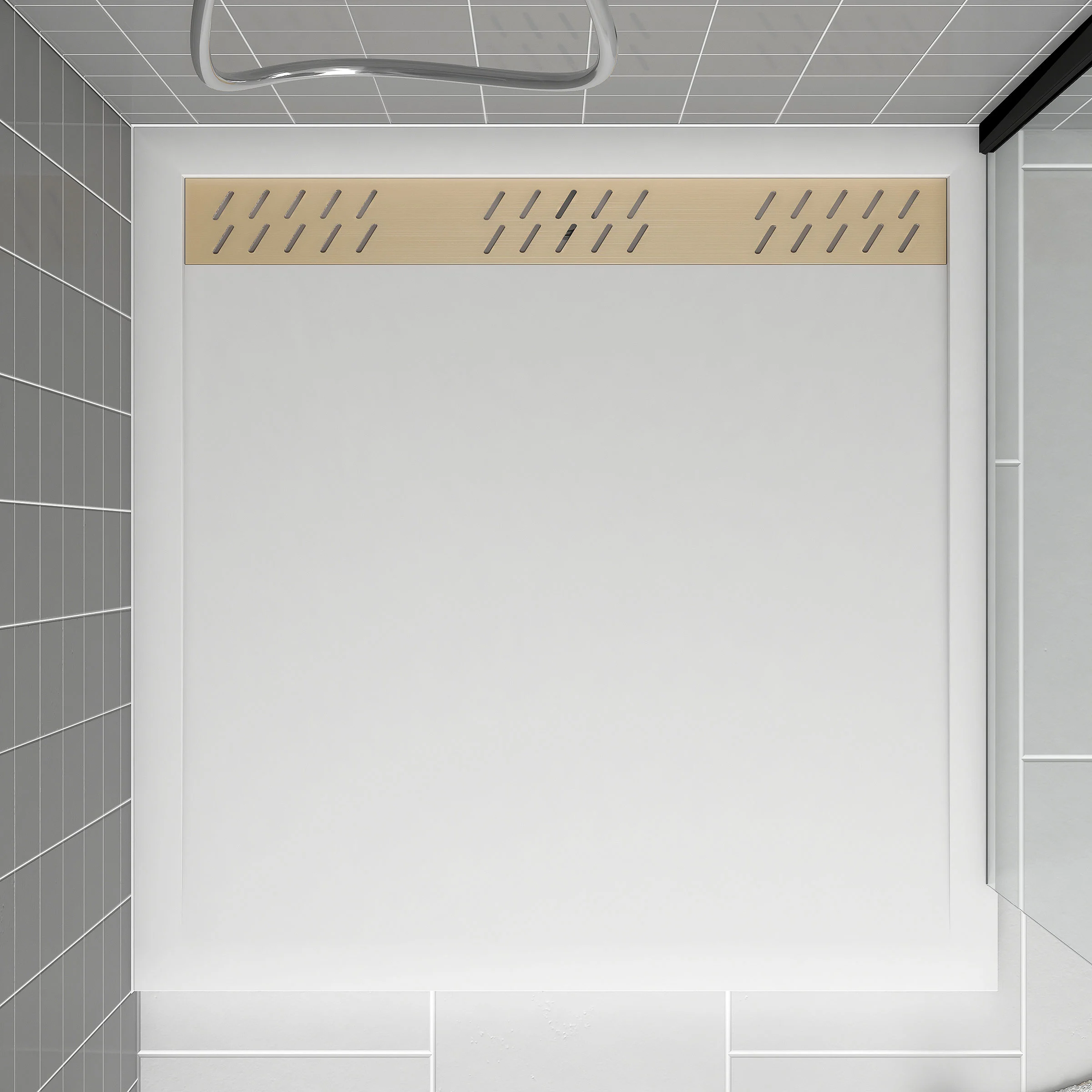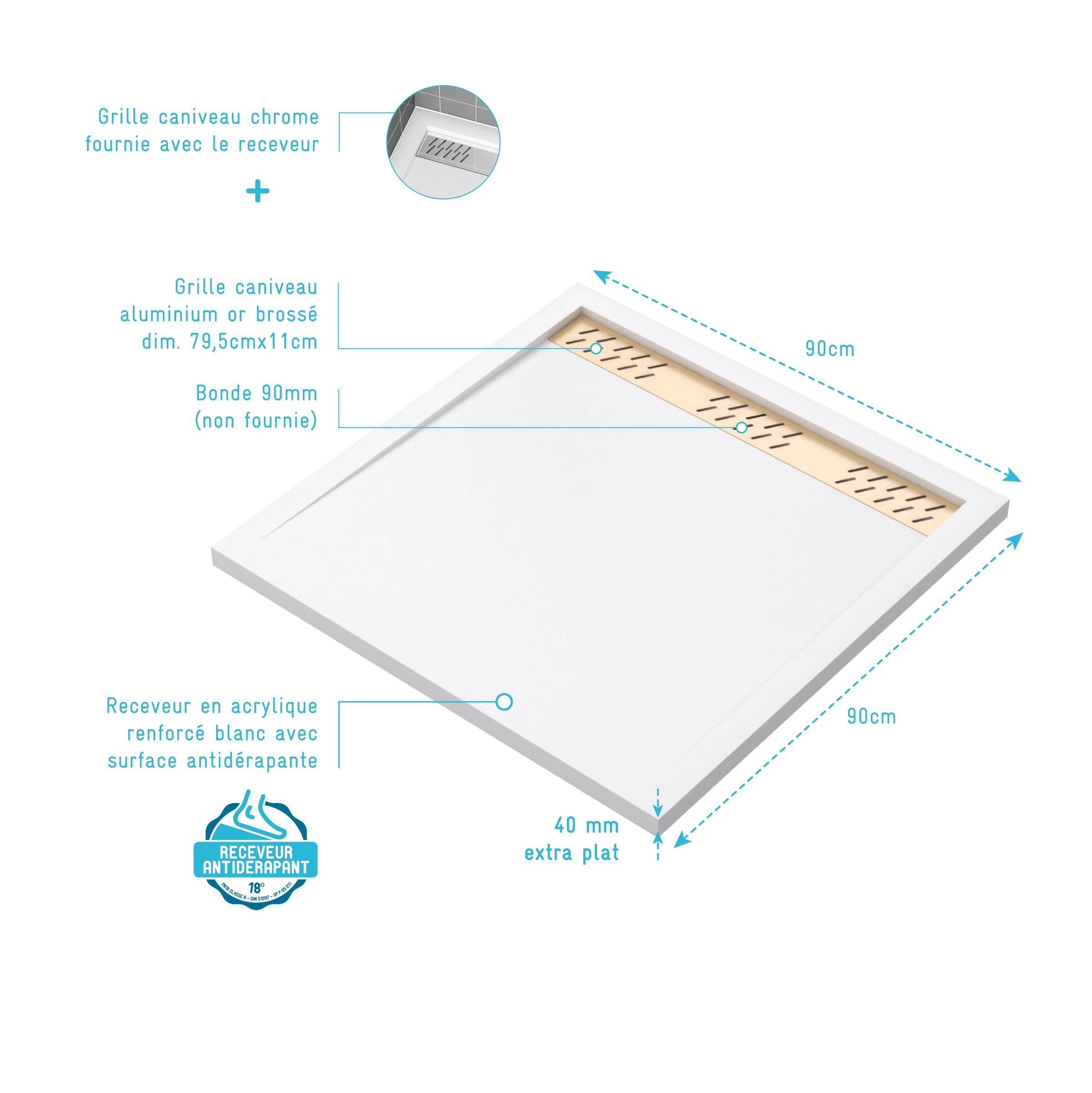 Receveur en acrylique Blanc 90x90x4 cm + Grilles Linéaires Chrome et Or Brossé – WHITENESS II