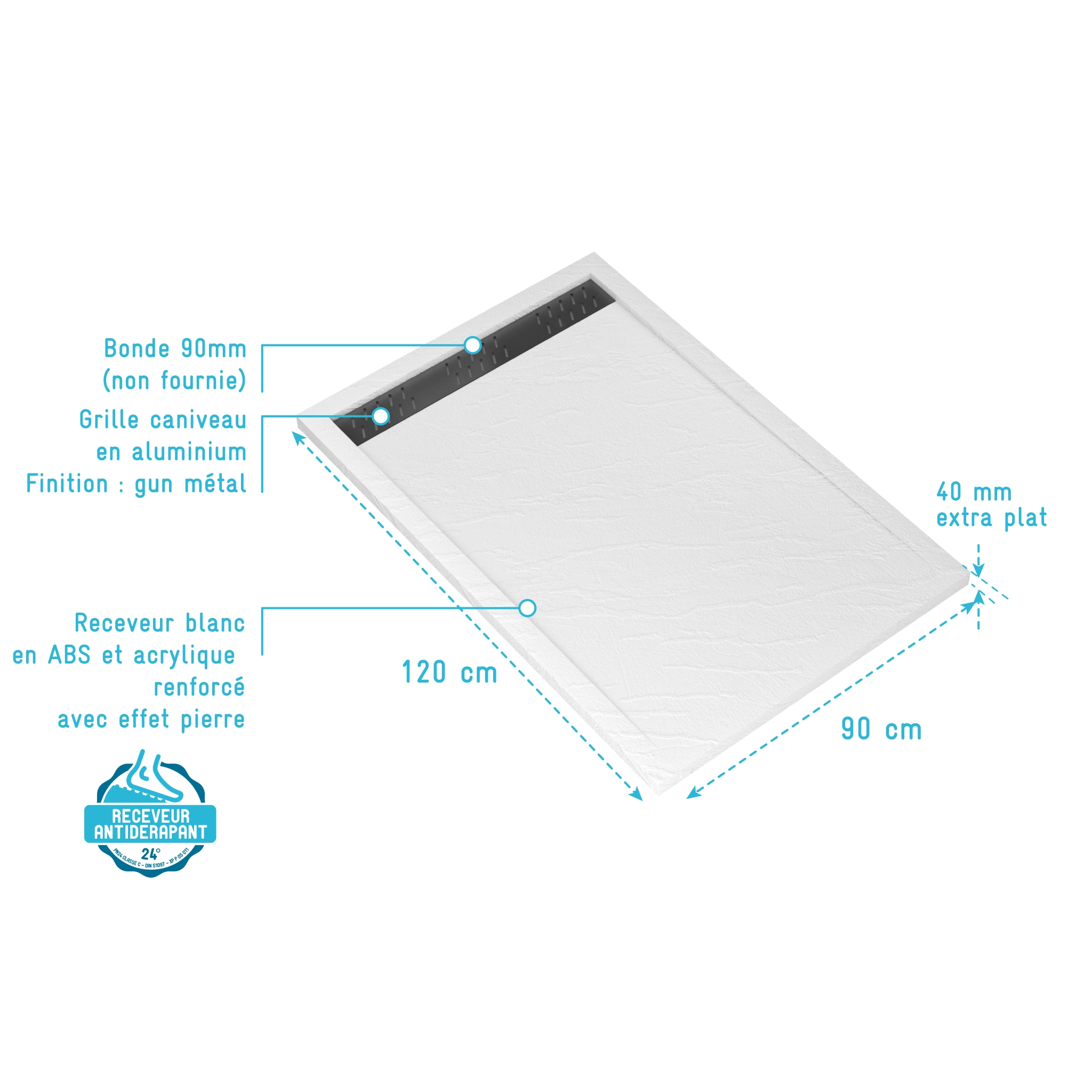 Receveur en acrylique Blanc Effet Pierre 120x90x4cm + Grilles Linéaires Chrome et Gun Metal
