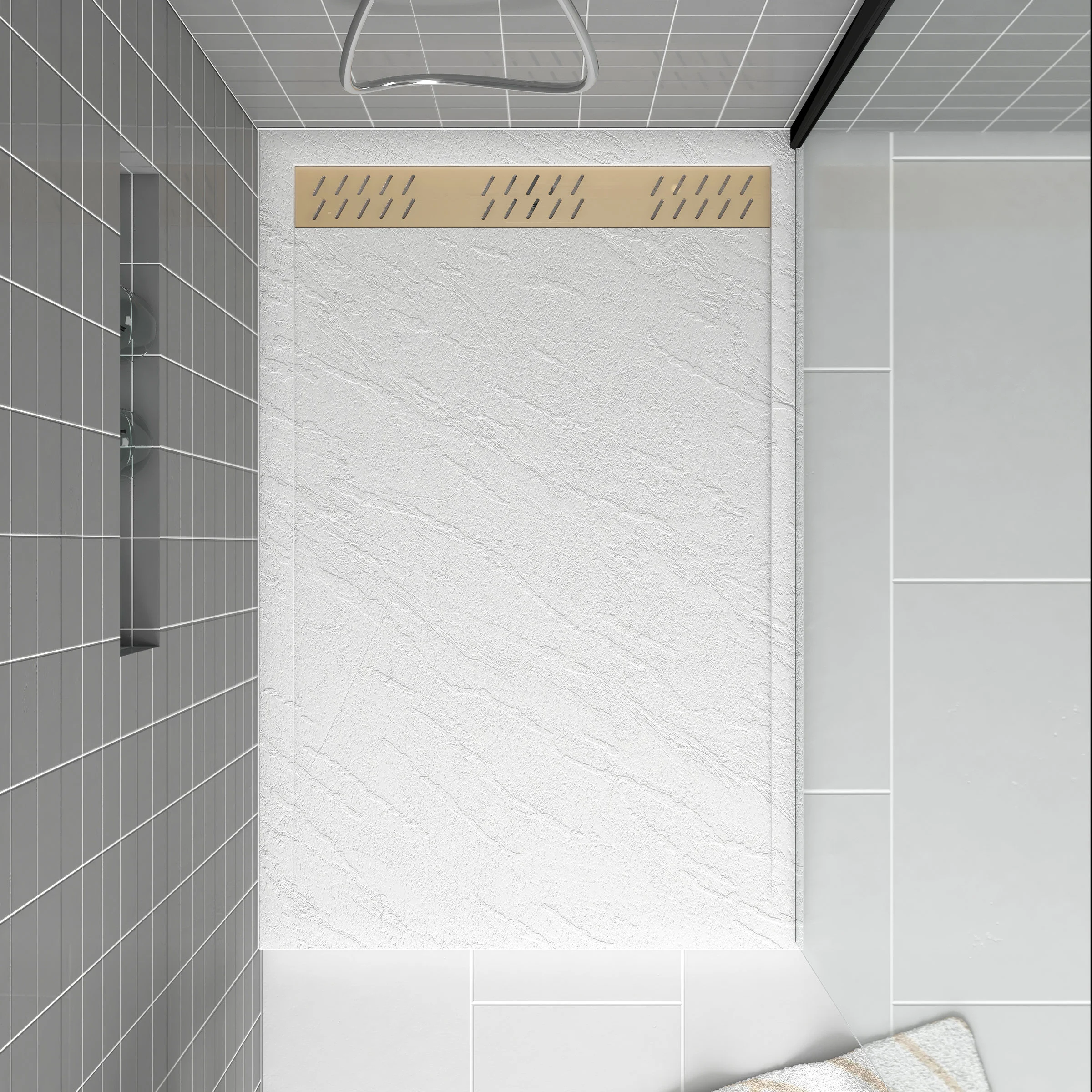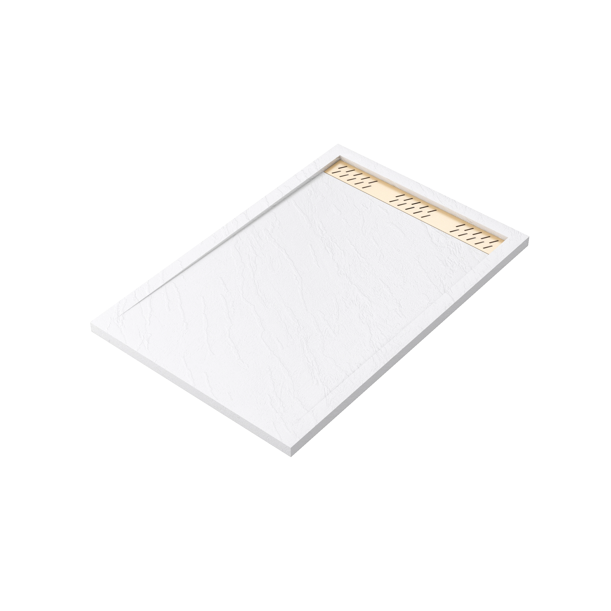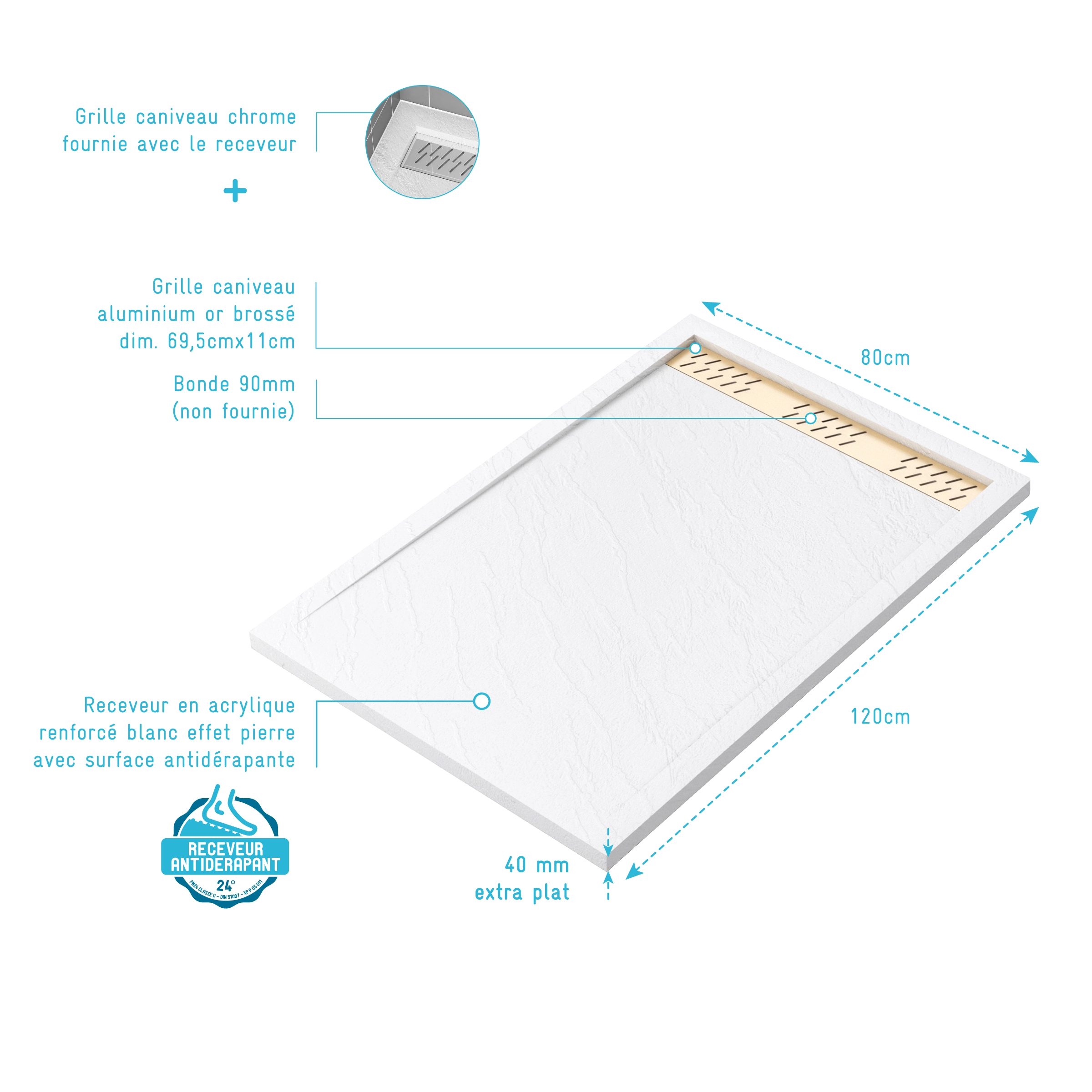 Receveur en acrylique Blanc Effet Pierre 80x120x4 cm + Grilles Linéaires Chrome et Or Brossé – MOON