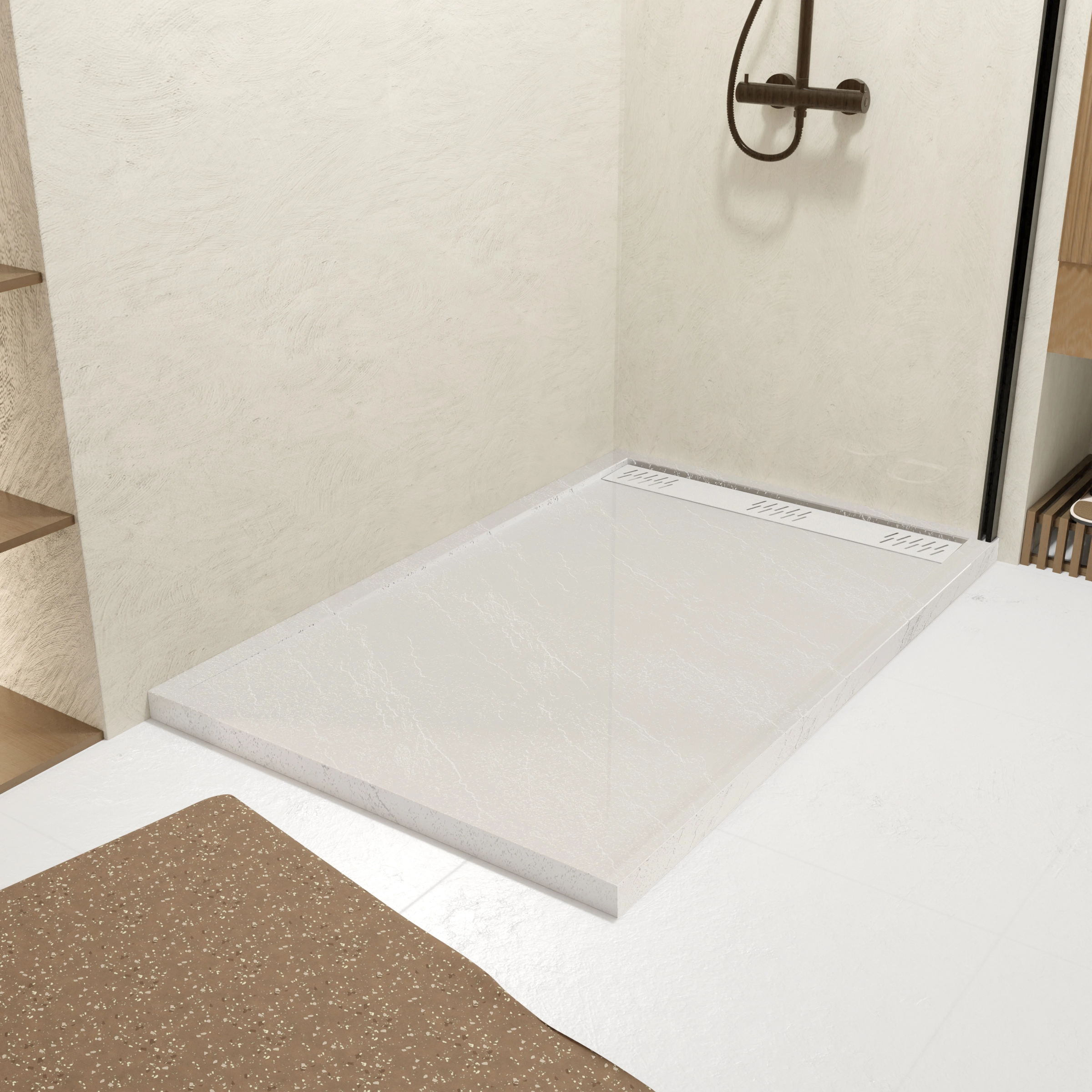 Receveur de douche en résine blanc 90x140x3 cm effet pierre granit + grille linéaire blanche mate