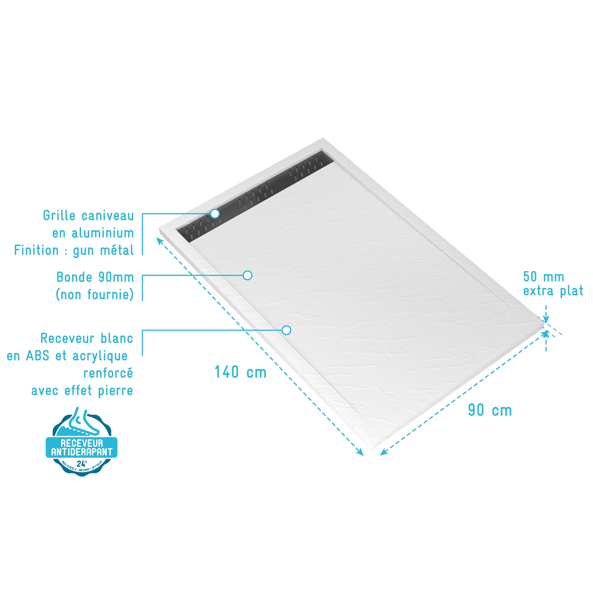 Receveur de douche en résine blanc 90x140x3 cm effet pierre granit + grille linéaire gun metal