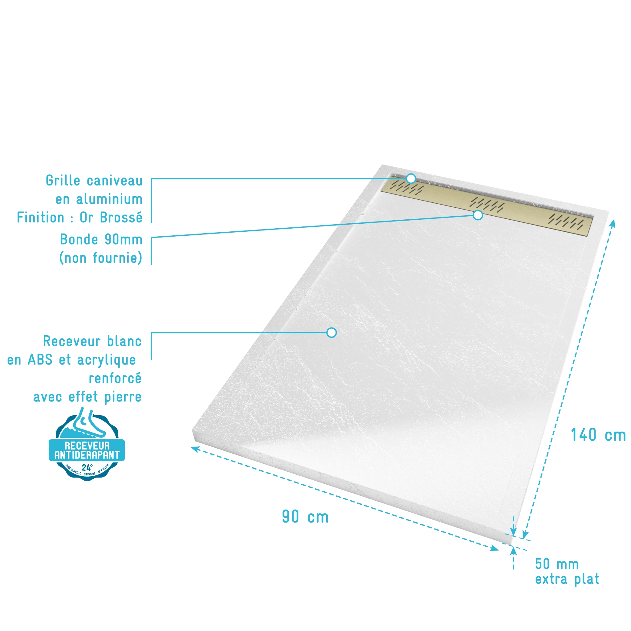 Receveur en acrylique Blanc Effet Pierre 90x140x5 cm + Grilles Linéaires Chrome et Or Brossé