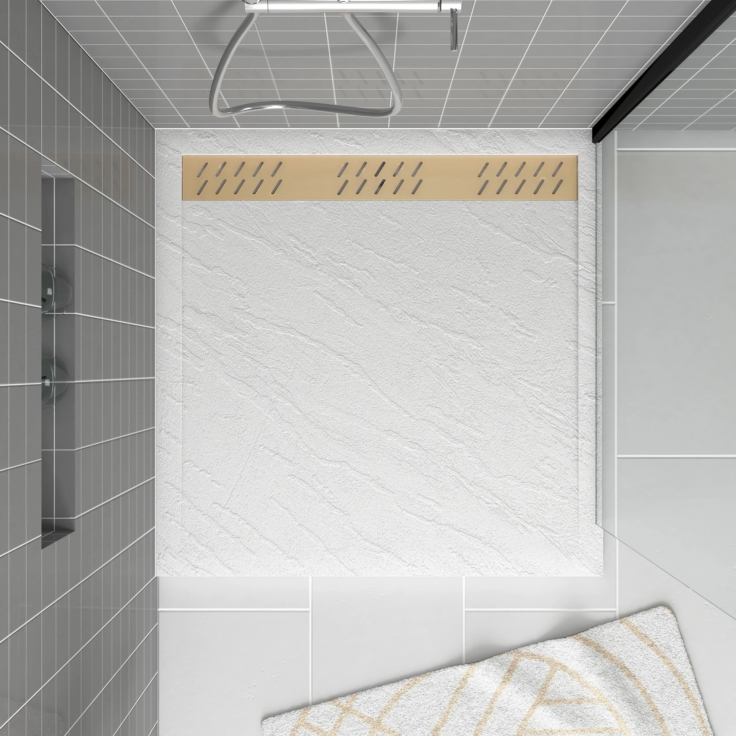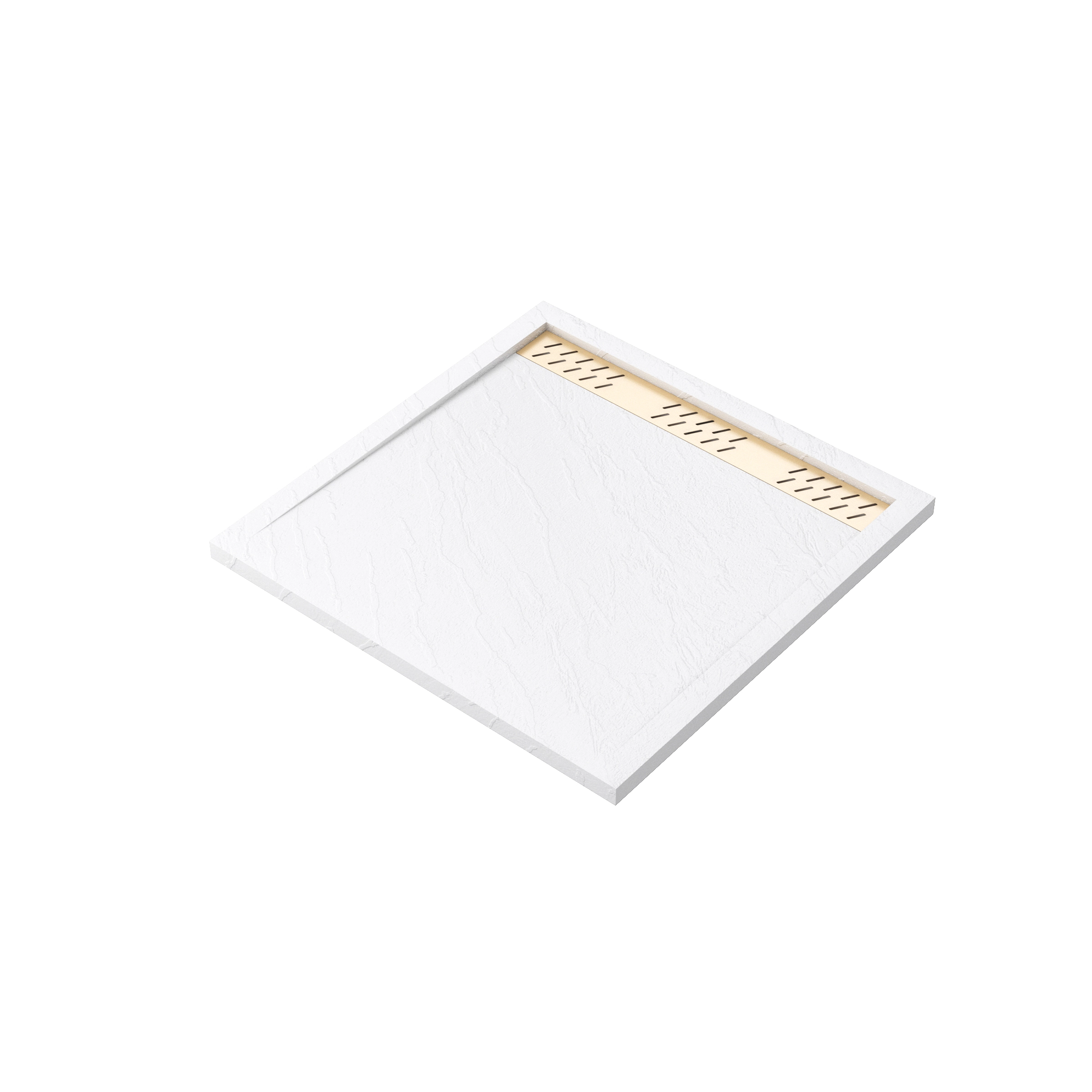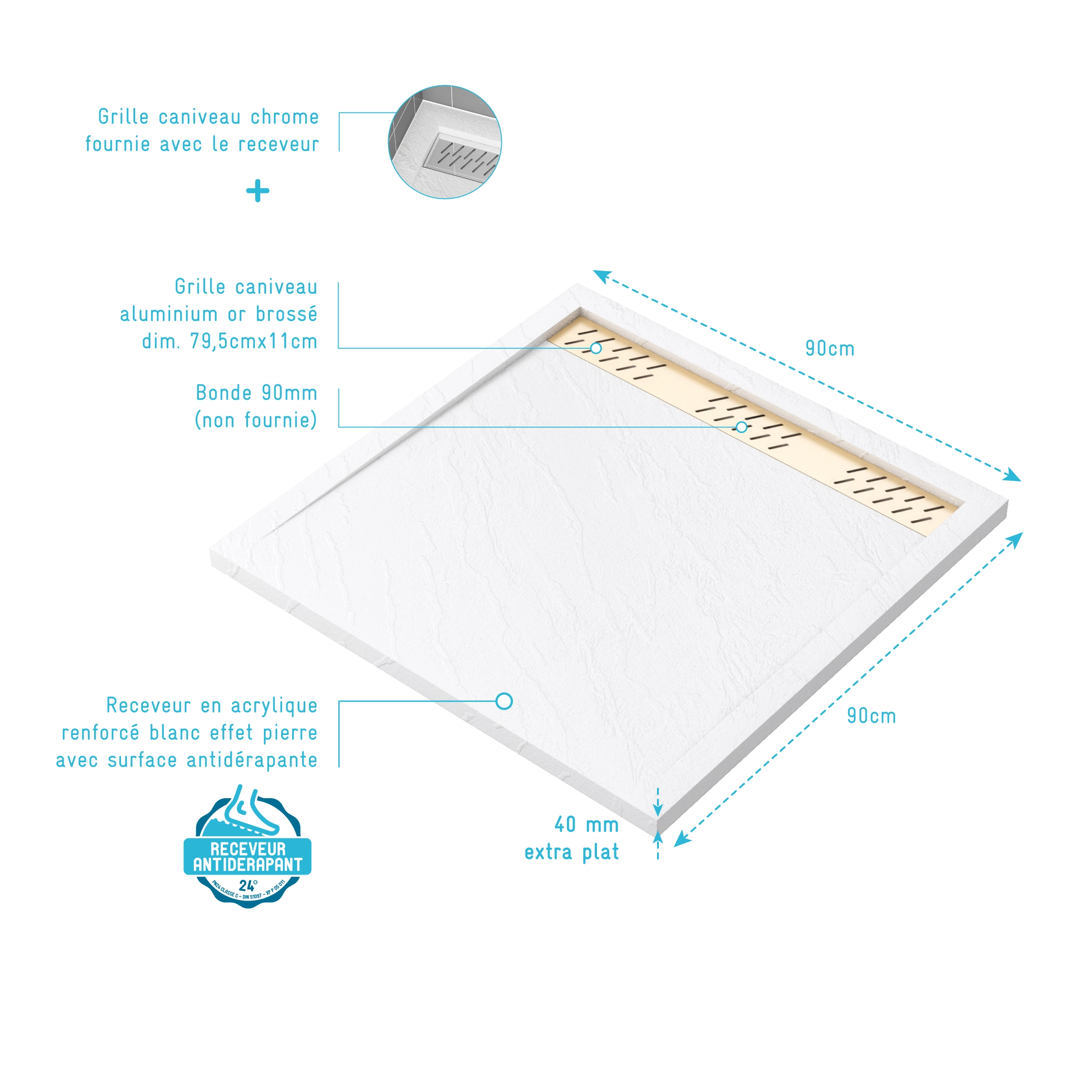 Receveur en acrylique Blanc Effet Pierre 90x90x4 cm + Grilles Linéaires Chrome et Or Brossé – MOON