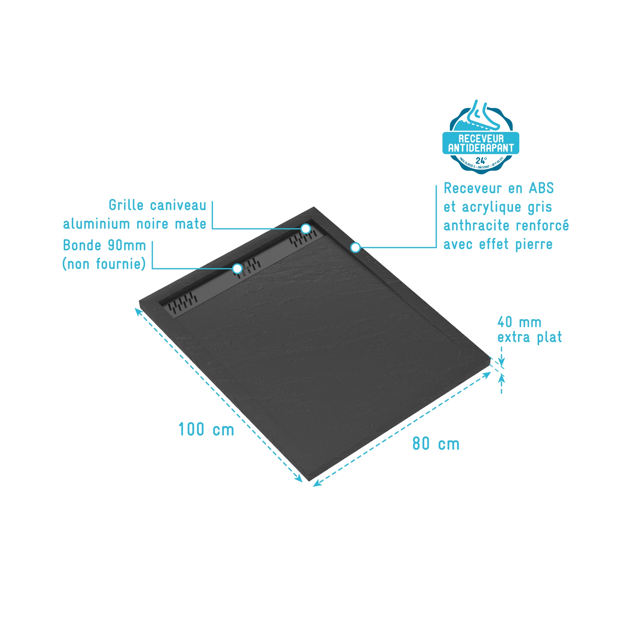 Receveur en acrylique Gris Effet Pierre 80x100x4 cm + Grilles Linéaires Chrome et Noire – METEORA