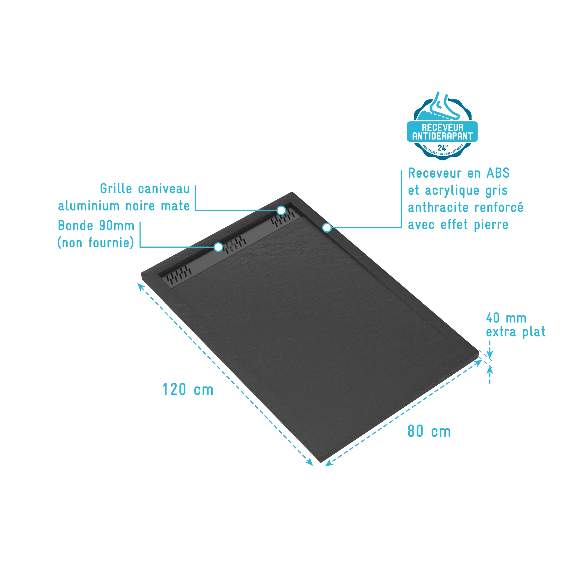 Receveur en acrylique Gris Effet Pierre 80x120x4 cm + Grilles Linéaires Chrome et Noire – METEORA