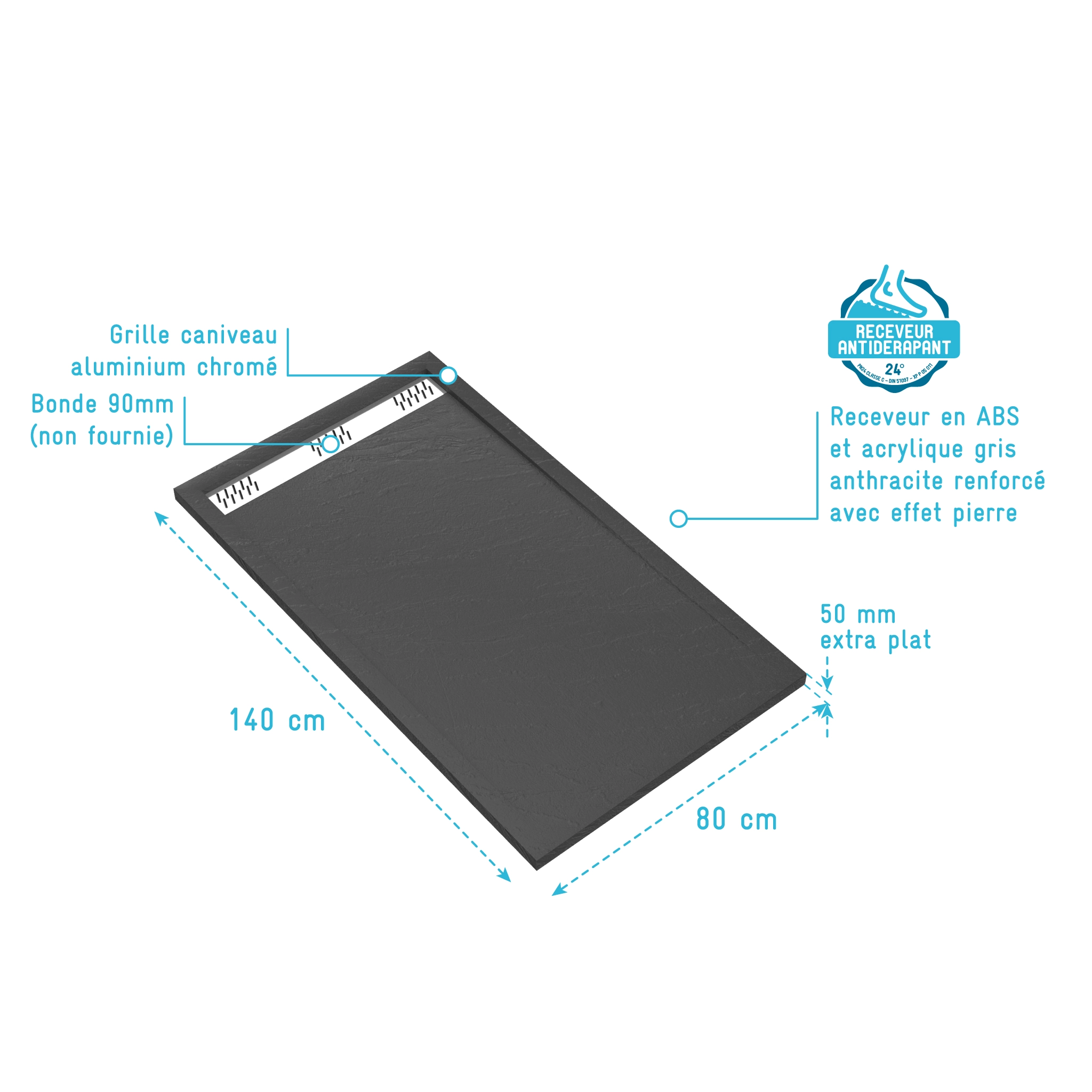 Receveur en acrylique Gris Effet Pierre 80x140x5 cm – Grille Linéaire Chrome – METEORA