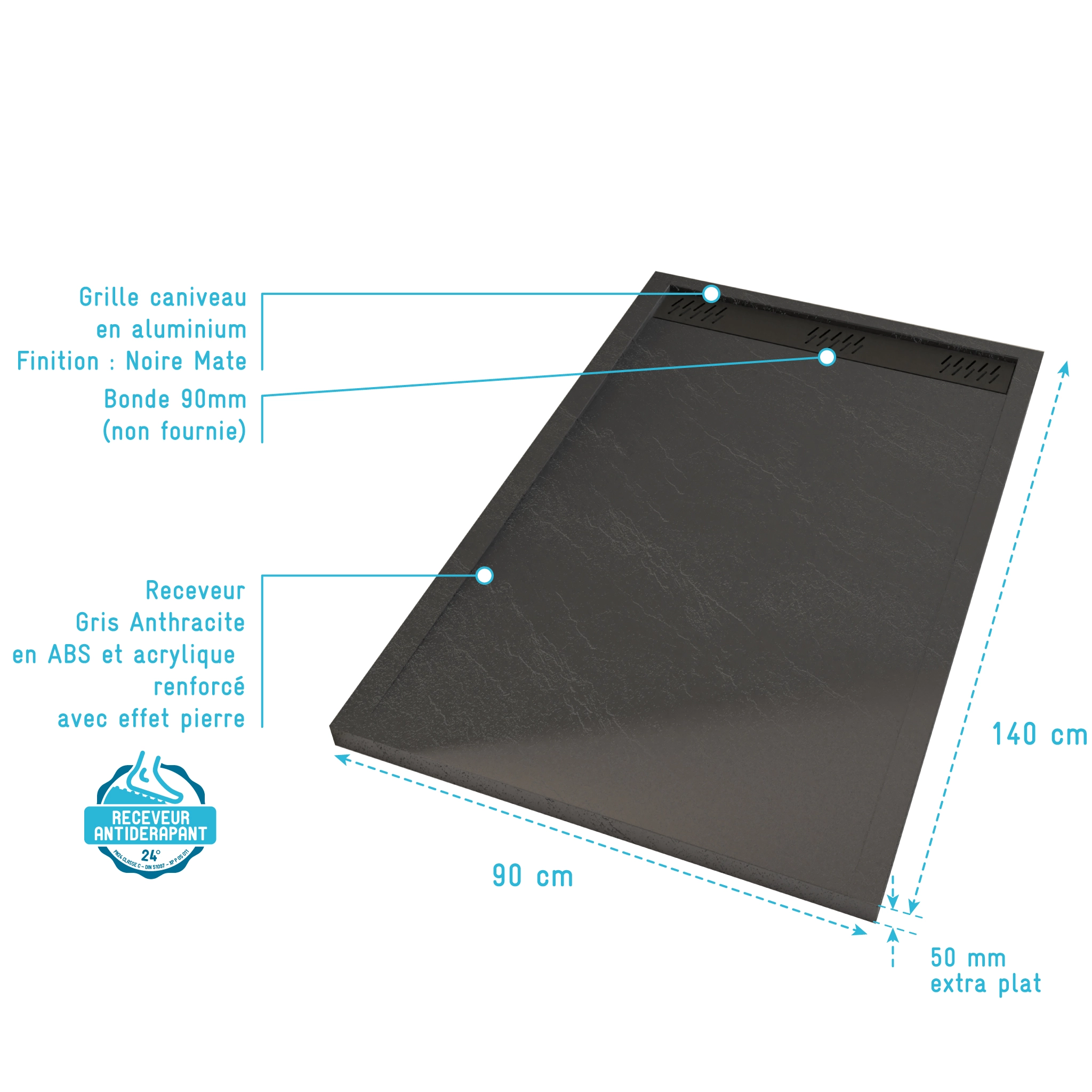 Receveur de douche en résine noir 90x140x3 cm effet pierre granit + grille linéaire noire mate