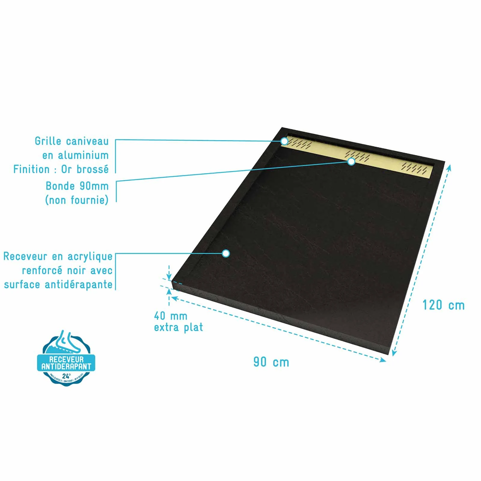 Receveur en acrylique Noir Effet Pierre 90x120x4 cm + Grilles Linéaires Chrome et Or Brossé