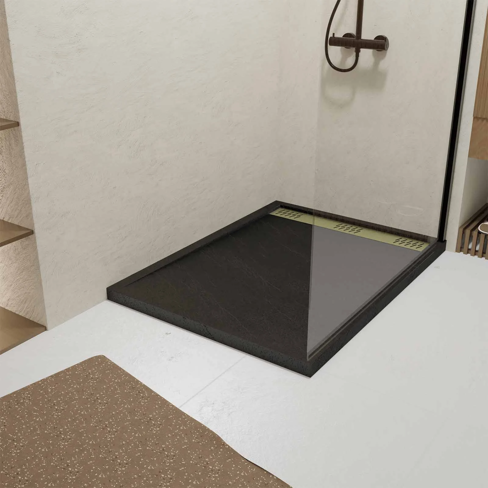 Cet ensemble Receveur Noir, Effet Pierre, s’accordera parfaitement à l’ambiance de votre espace de douche.