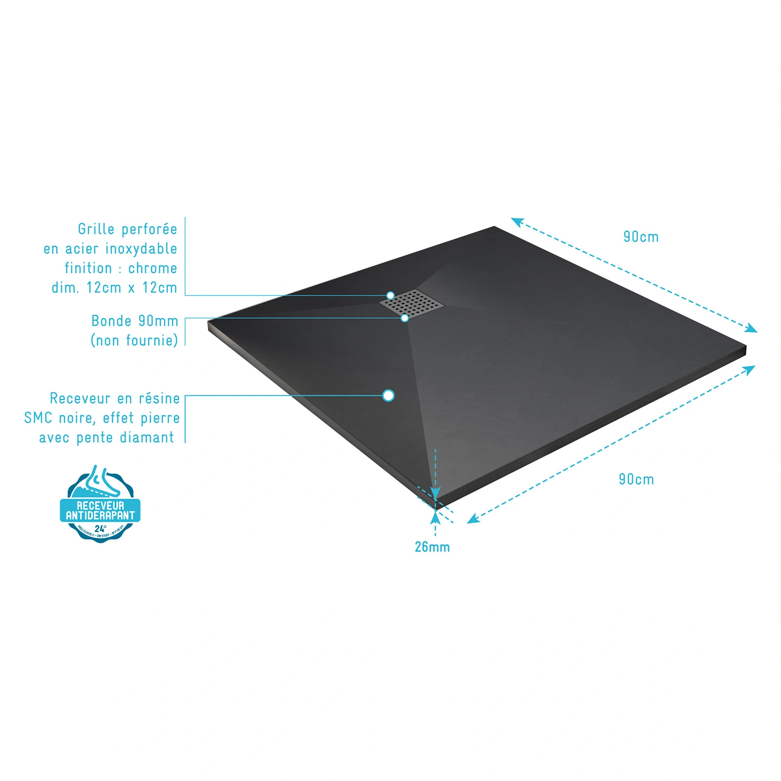 Receveur en Resine SMC Effet Pierre Noire 90x90cm – Grille Inox – ROCK 2